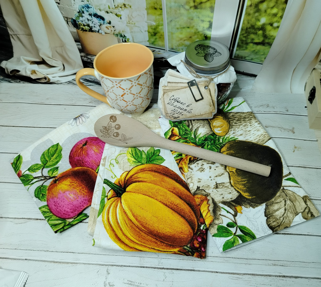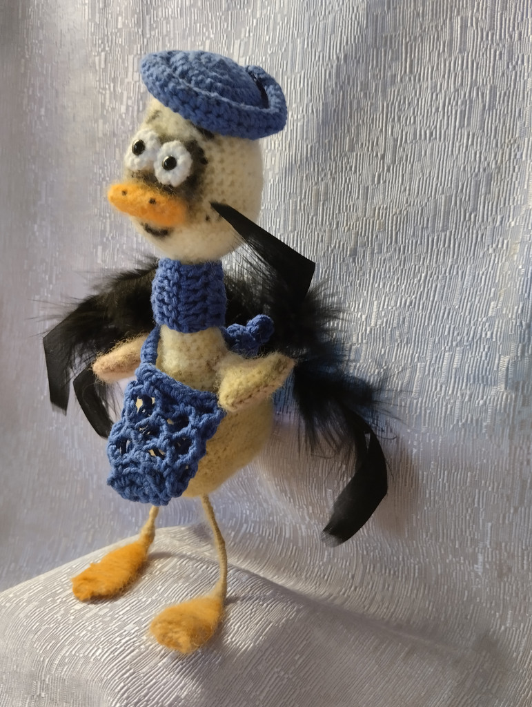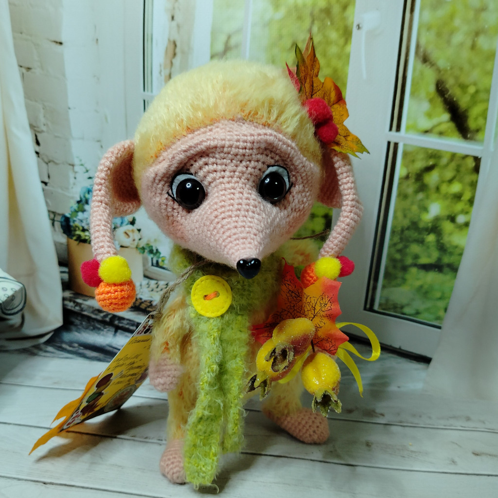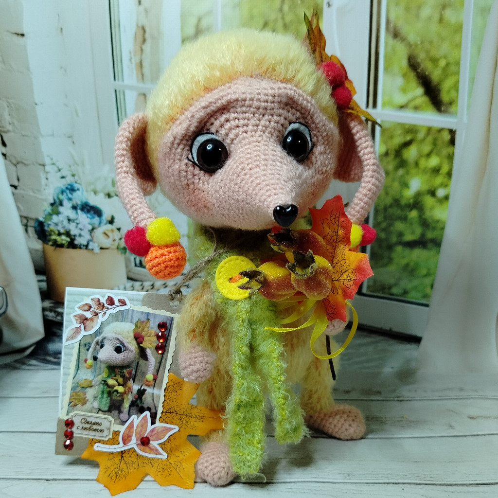 Полотенчики такие красивые с яблочками, тыковками и грибочками. Яркие, осенние. Деревянная ложка (обожаю всё из настоящего дерева), кружечка для чая, и баночка засушенного шиповника. Прямо как чувствовала, что мне сейчас необходимо Для моего творчества тканюшечки такие милые, пуговки разной формы и цвето, подвесочки, бубенчики, бусинки, цветочки. Вобщем столько красоты! Да ещё кружавчики и тесёмочка праздничная с позолотой. А привёз это всё вот этот чудесный Чудик. С длинным носиком и большими глазками. Мы причесались, пообнимались. И вот готовы Красавчик!
