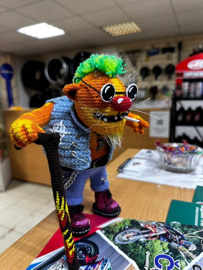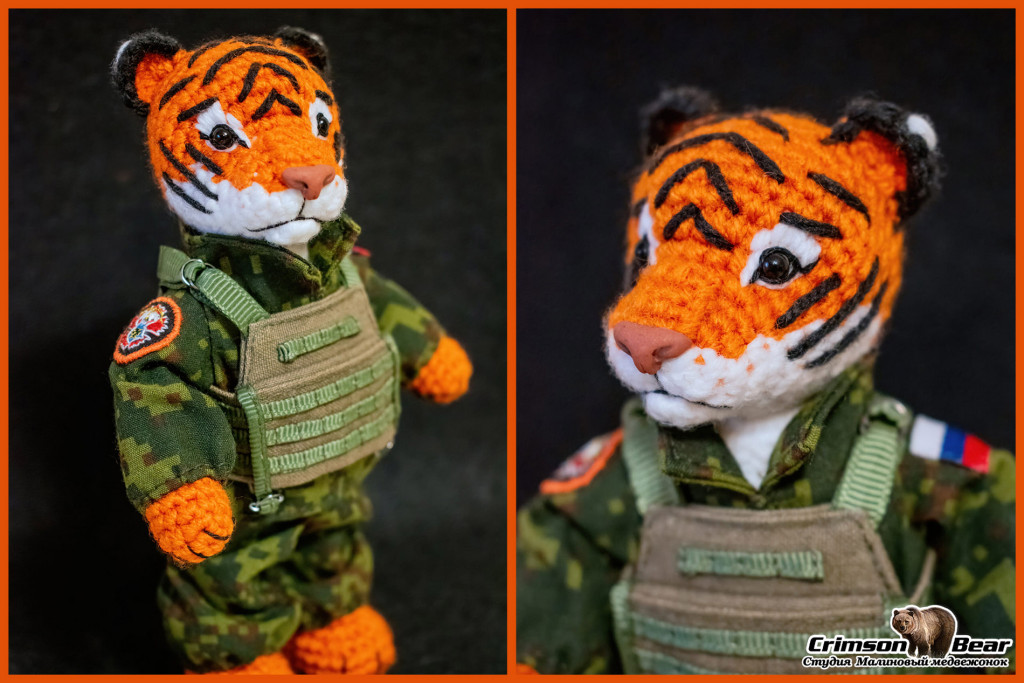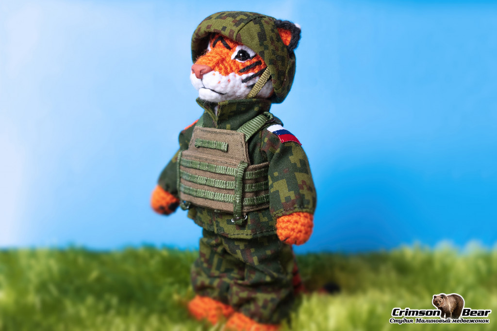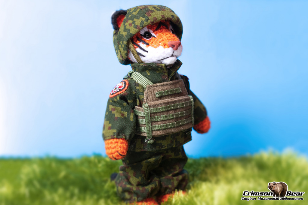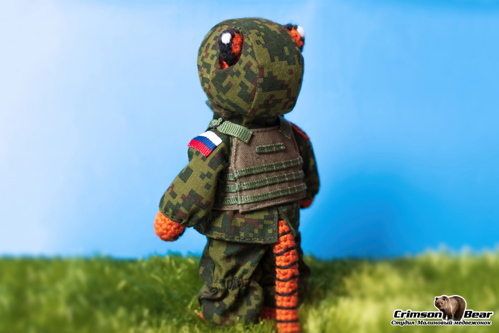 Размер 15 см. Голова на шплинтовом креплении, лапы на меднопроволочном каркасе. Пиксельный камуфляж. Нашивка 22й бригады спецназа.