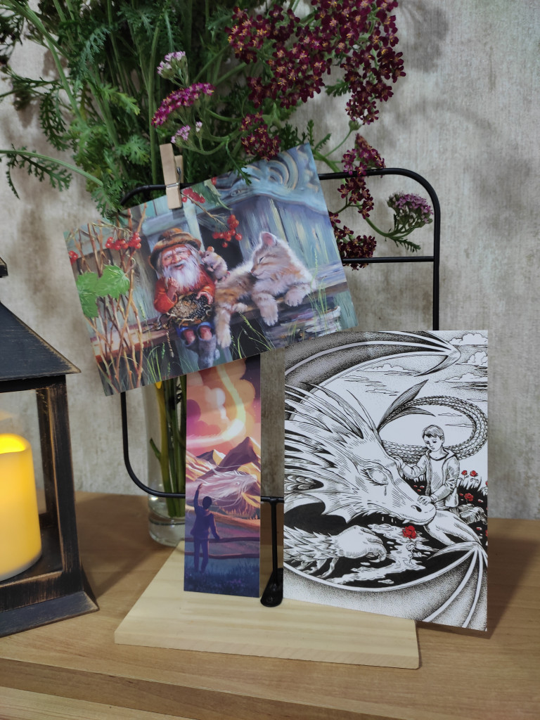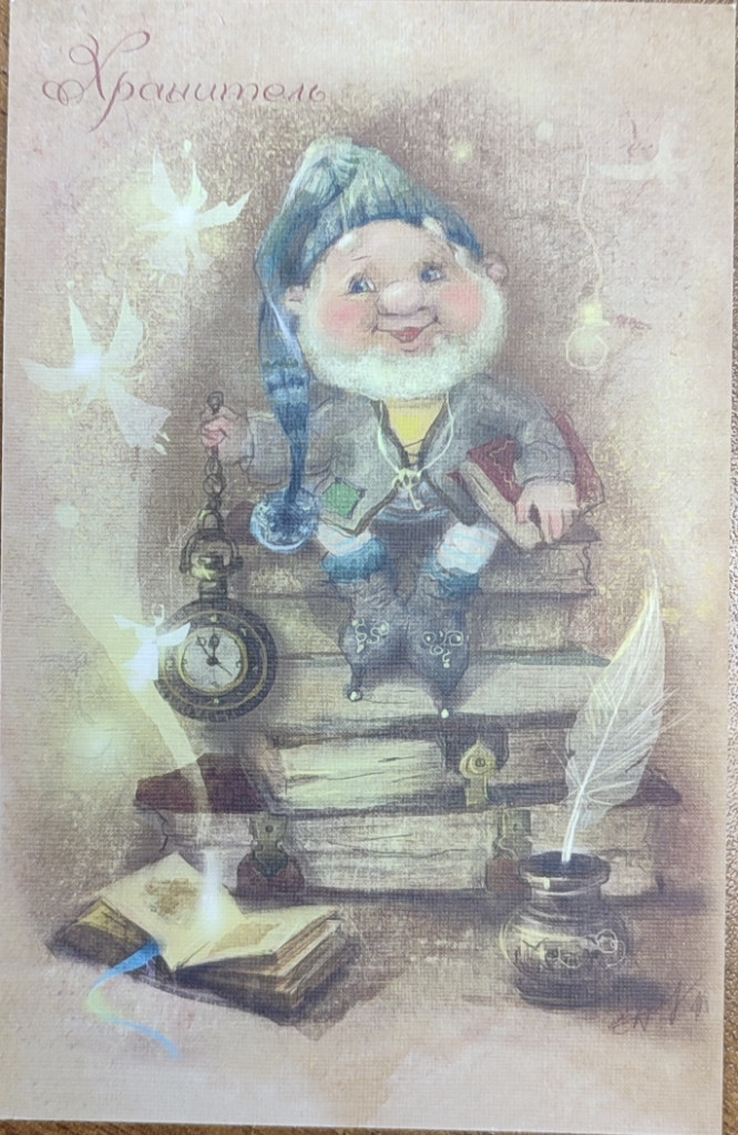 И у меня волшебный котик от @МариМари , Маши! А ещё конвертик от @ЖеняВолодина , такой шкодный домовой! А ещё с драконами открытка и закладка! А какой оборот у открытки!!!