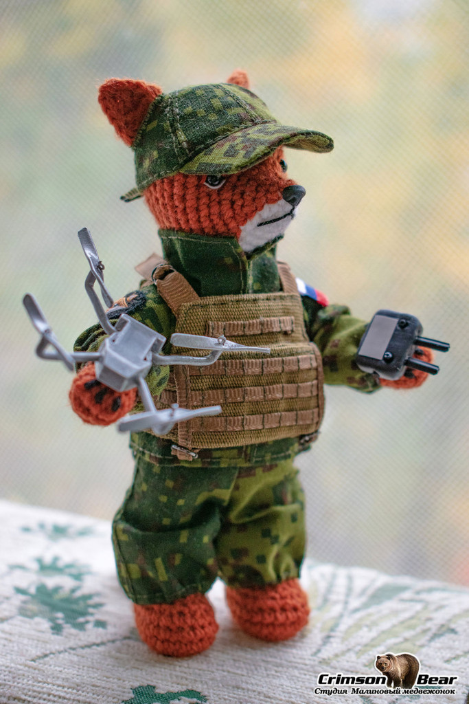 Лис в военной форме, размером 14 см. Поворотная голова на шплинтовом креплении, подвижность лапам и хвосту придает каркас из медной проволоки. Квадрокоптер, размером 5 см. и пульт, размером 1,5 см., крепятся к лапам с помощью резинки. Съемными элементами также являются кепка и бронежилет.
