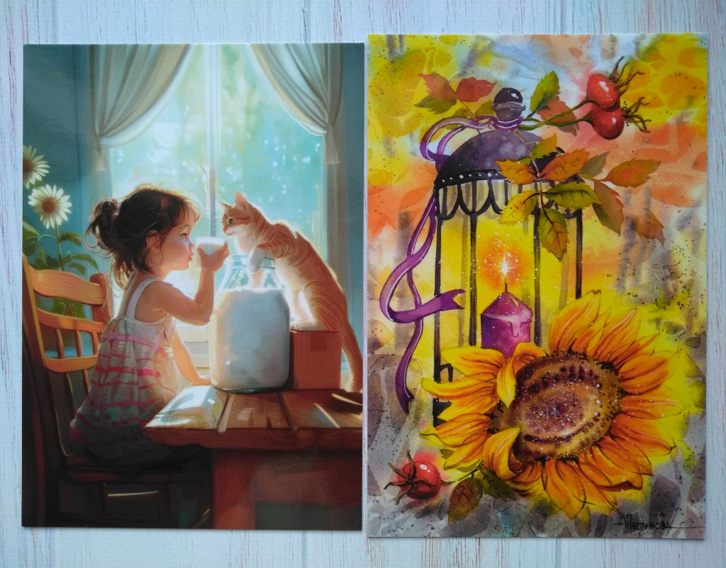 От Жанночки @Анюта8 пришла открытка из игры "Сюрпризный алфавит", П - пушистое чудо, очаровательный котик. И ещё сюрпризные открыточки, все очень красивые, но вот девочка с котиком попала в самое сердце. Вспомнила , как в детстве молоко продавали из фляг, и все приходили с бидончиками или 3-литровыми банками. Самое вкусное молоко было)) От Наташи @totoshka пришёл пухленький конверт по осеннему обмену. А в нём столько красоты