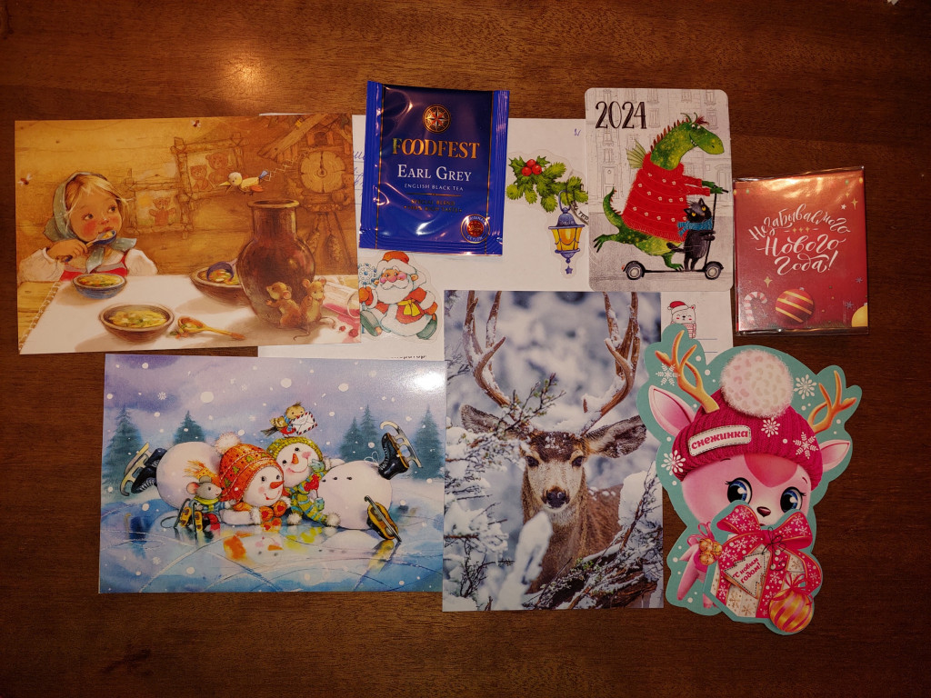 Открытки очень красивые: снеговички Е.Чистотиной, девочка-Машенька Е.Бабок, олень-красавец, смешной оленёнок.(коллекция пополняется) А ещё календарик с весёлым дракончиком, чаёк и даже маленькая шоколадка. :yahoo:
