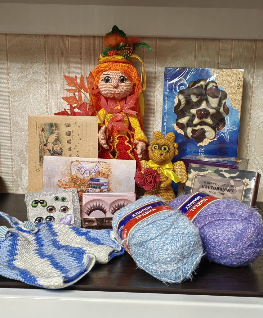 Светочка, спасибо тебе огромное за такую яркую, по настоящему осеннюю игольницу. Светлана просто, как осенним листопадом, засыпала меня подарками. Я даже не ожидала такого количества игрушек! Пряжи и хомячих радостей. ох, теперь мой сад- огород просто будет утопать в цветах, а я каждый день буду любоваться ими и вспоминать наши обмены и Светочку