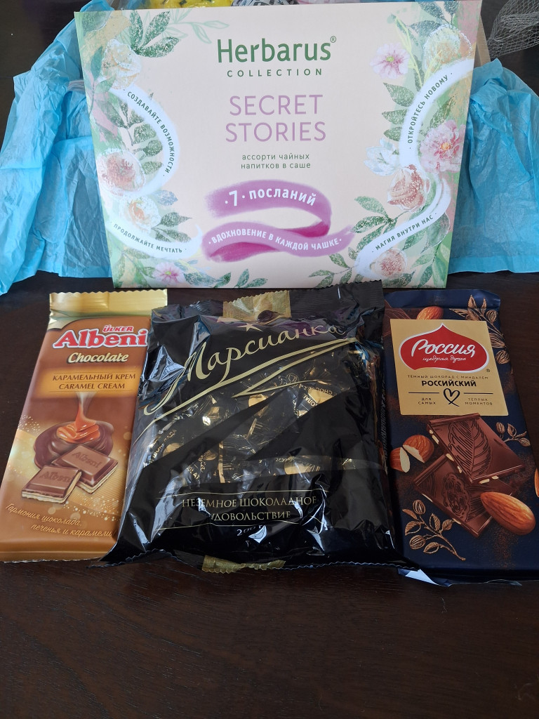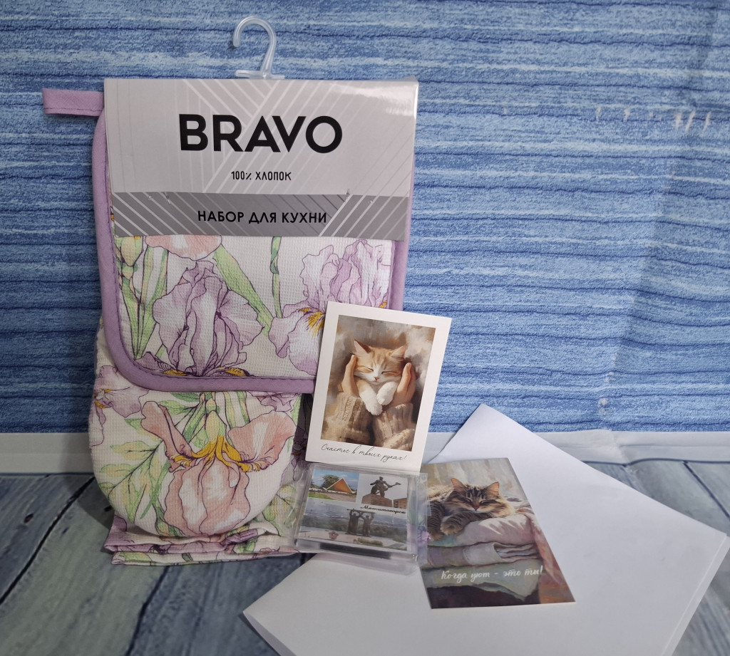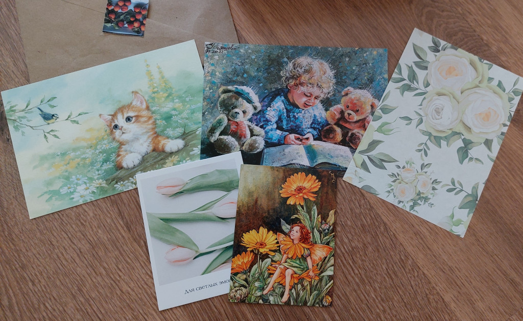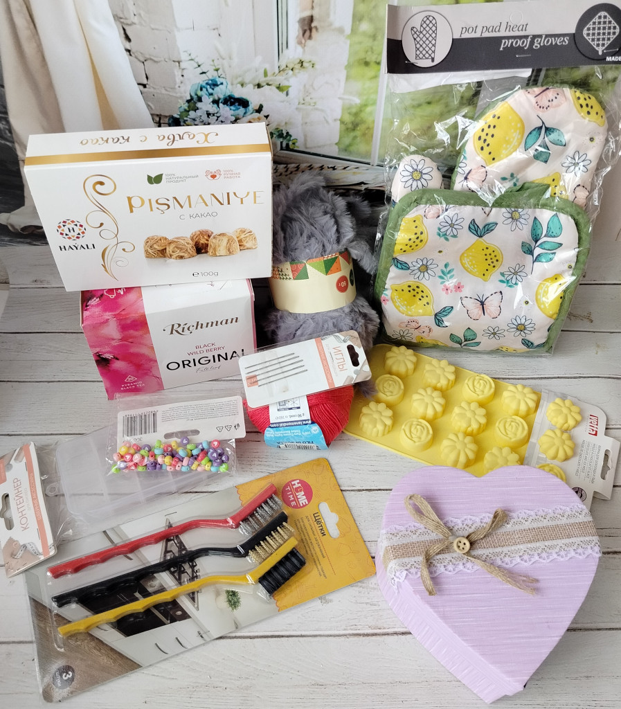 Первым делом достались сладости и чаек, затем красивейшая цветочная прихватка и полотенчико, открыточки, магнитик и письмо.