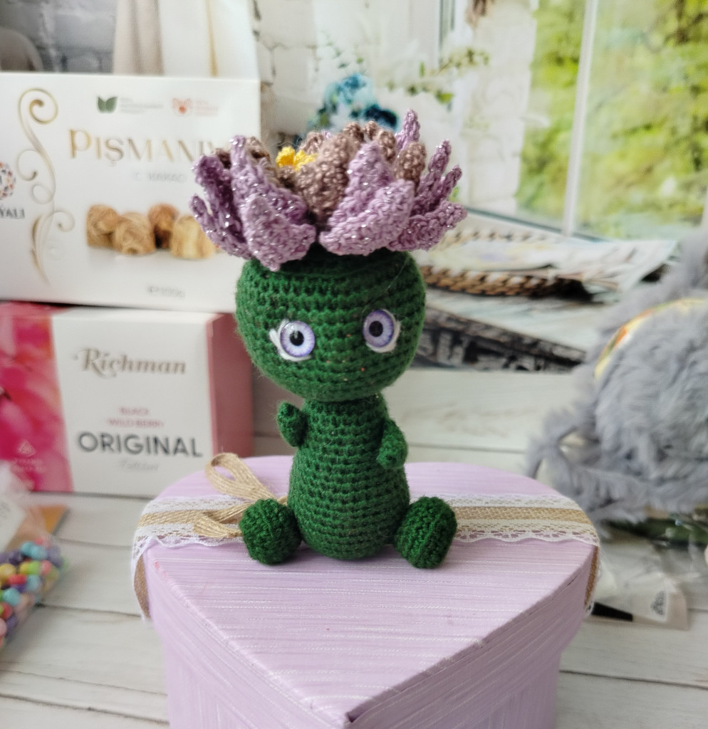 А в ней столько подарочков: сверху лежали щеточки для кухонной плиты, а также прихваточки для кухни и формочка для шоколада и льда. Чай с ароматом дикой ягоды, запах от него просто умопомрачительный. Очень люблю такие чаи. К чаю восточные сладости, такие прикольные на вкус, уже попробовала. Дшя творчества - два моточка пряжи, иголочки с большим ушком, бусинки для украшений и контейнер для бисера (очень нужная вещь) Ну а главный герой подарка - маленький, очаровательный чудик с цветочком лилии на макушке. Такой очаровательный малыш! Аня, ещё раз огромное-преогромное спасибо за чудесный подарок. Цветы я люблю, но только живые. Вязаные цветы, как букеты, не люблю, нет в них реалистичности. А вот цветочки, как декор, в изделиях нравится.