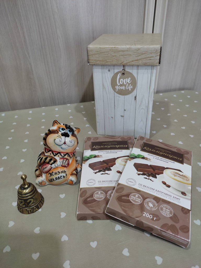 А ещё огромные шоколадки и котик, котик в мою коллекцию, да ещё такой позитивный! Жизнь удалась - когда распаковываешь такую посылку, то это верно!
