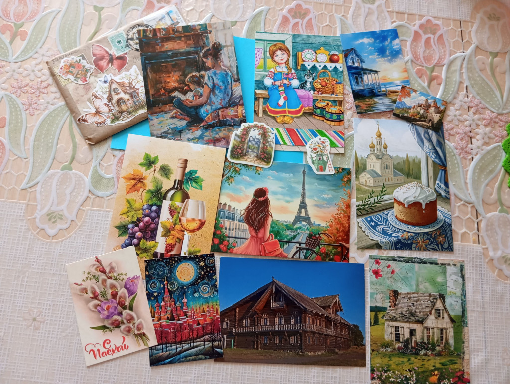 Открыточки по нашей игре на одну букву, поздравление с Пасхой, и по обмену Домики и много сюрпризных открыточек и наклеечек. Спасибо большое, дорогая