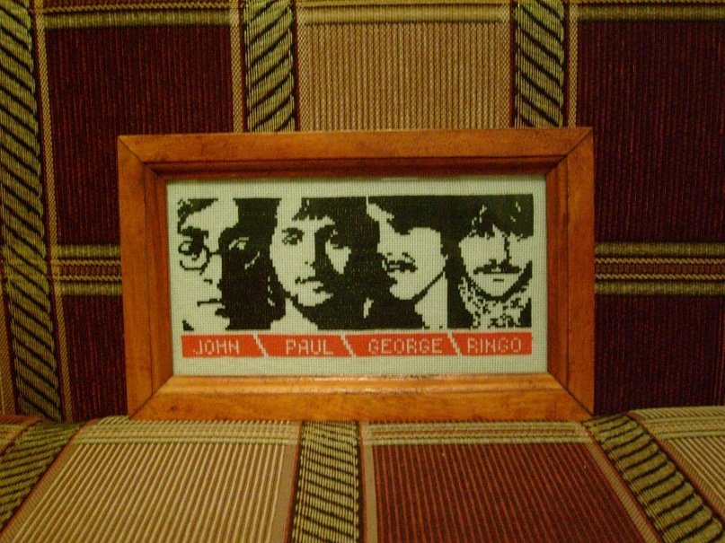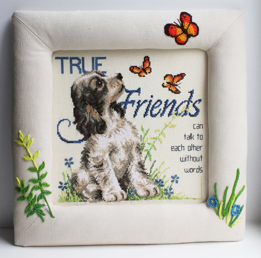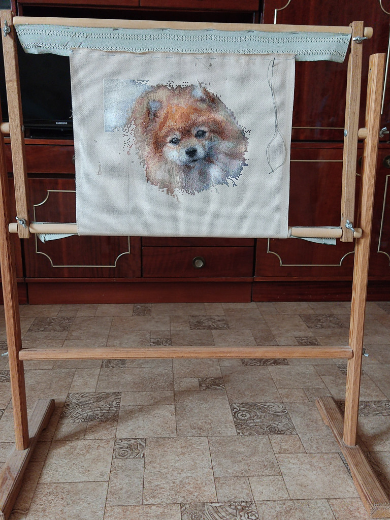 Есть ещё вот такая, не законченная. Это мне сын сделал схему по фото любимой собачки. Вышиваю мелким крестиком.
