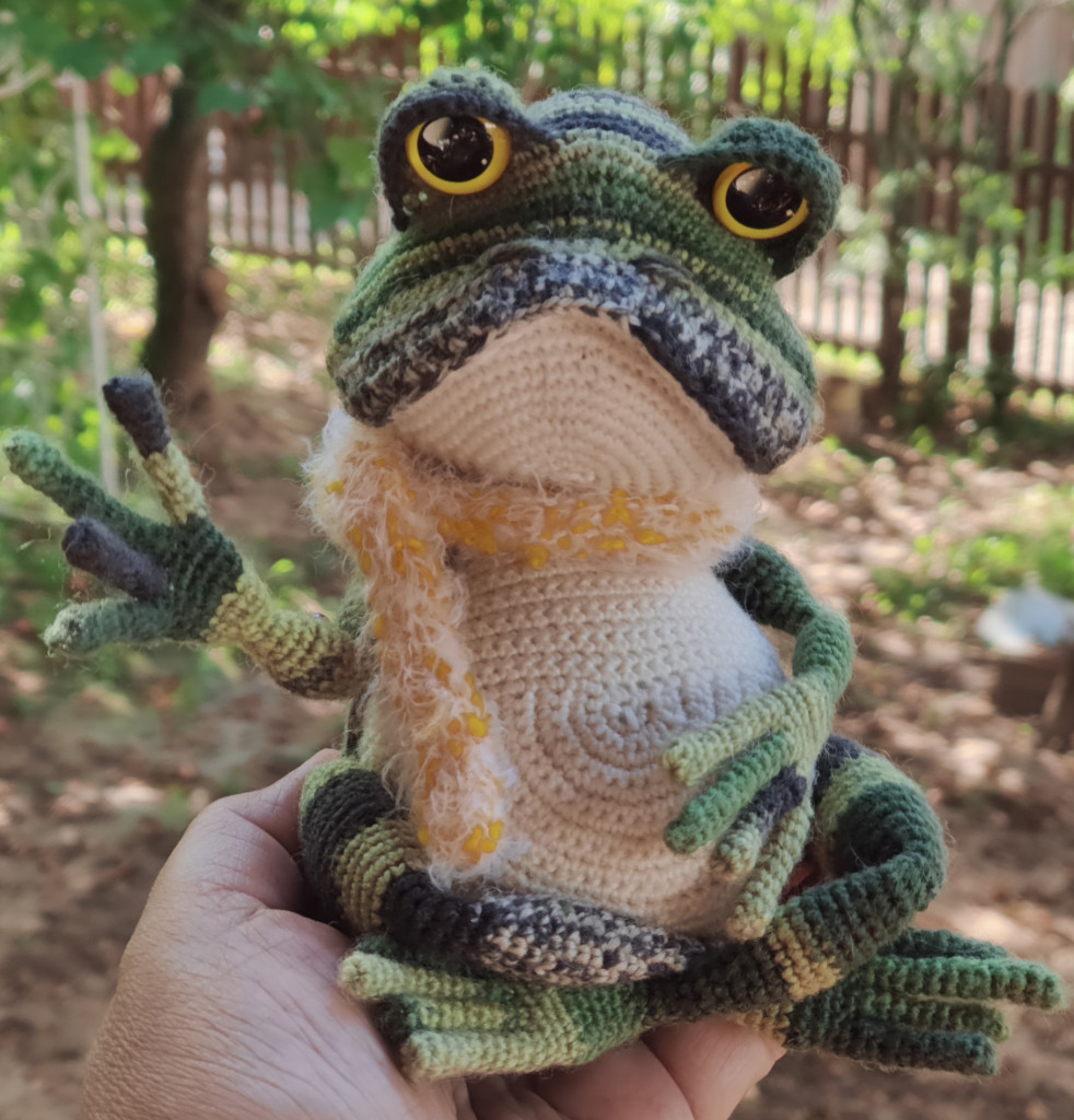 И вот еще одна лягушка, больше как демонстрация того, как делать не надо и лучше выбирать указанные нитки. Эта лягушенция вымотала мне все нервы и все равно не получилась такой, как я хотела и задумывала. В общем, примите к сведению, что из фактуры типа любой меховушки у вас получится вот такое странное существо)