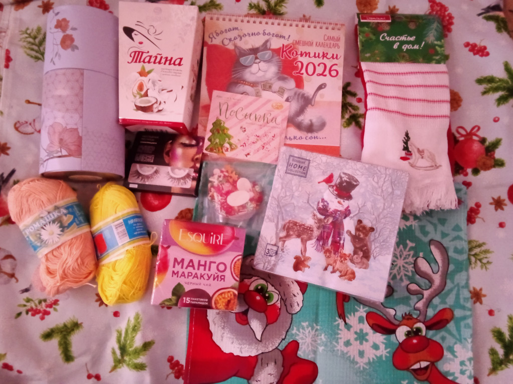 Доброе утро. С Новым 2026 годом! Кое-как дождалась 1 января. Посылочка пришла мне от фенечки Елены Фортыгиной Дорогая Елена нам всё очень понравилось. Целая кладезь нужных и полезных подарков. За стеклянный новогодний шарик отдельное спасибо. Наш разбил кот. И теперь у нас есть новый. Спасибо за щедрость, радость и хорошее настроение. Прилагаю фото несметных богатств.