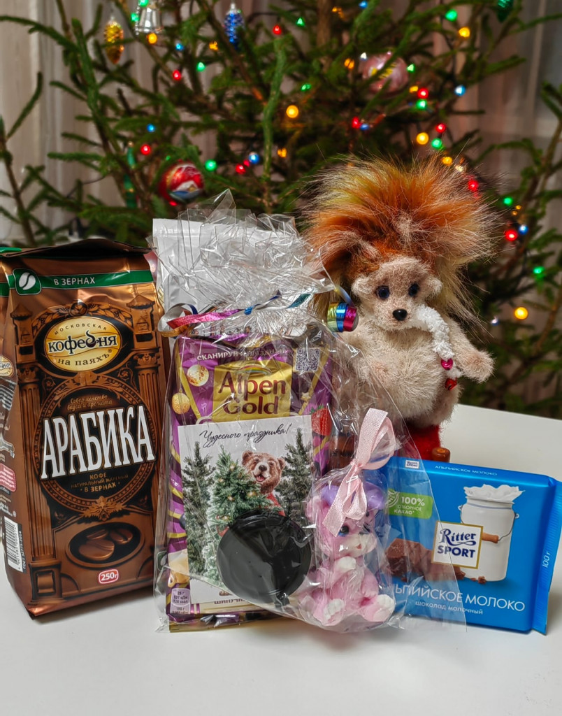 а вот ежулька со сладостями вместе А вот там, в маленькой черненькой коробочке - третья часть подарка.