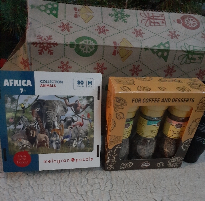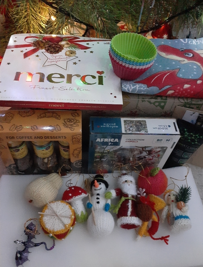 Брошь-дракончик Пазл и приправы Крем для рук Шоколад Формочки Полотенец с дракошкой Открыточка с пожеланиями Дорогая Оленька,спасибо тебе огромное что исполнила мою мечту!Я несказанно счастлива!Полночи разглядывала,щупала их.Они пропитаны по моему пва.Прям настоящие ёлочные игрушки.Заглядываюсь на ватные,сама не решаюсь пробовать их делать,но эти прям миниатюрные похожи даже на ватные,особенно ангелочек и дедулька.С Новым годом тебя и твою семью,здоровья твоим золотым ручкам и всех благ!