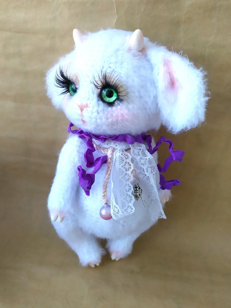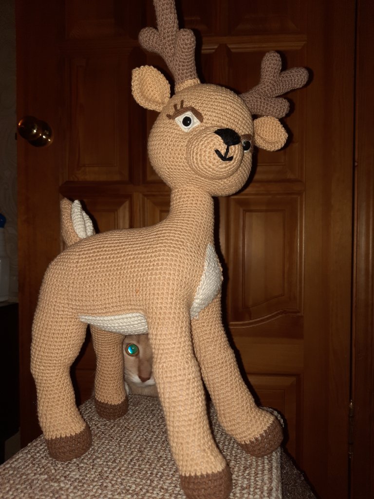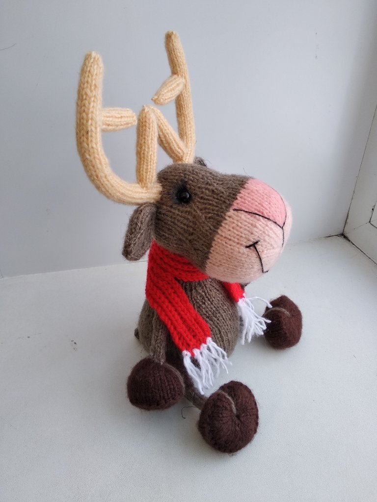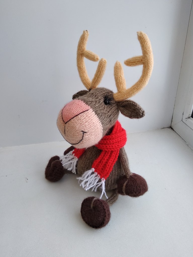 Мифический крылатый олень, родом из Атлантиды. Связан из шерстяной пряжи, наполнен холлофайбером. Размер до макушки 10 см, до кончиков рогов 14 см. Глазки пластиковые на безопасном креплении.
