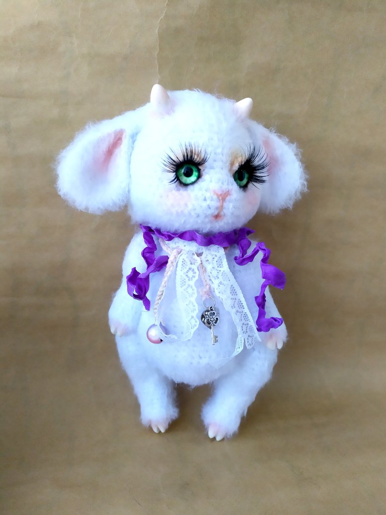 Размер игрушки 10 см. Связан из акриловой пряжи, наполнен синтепоном, декоративная отделка из фактурной пряжи. Пластиковые глазки на безопасном креплении.