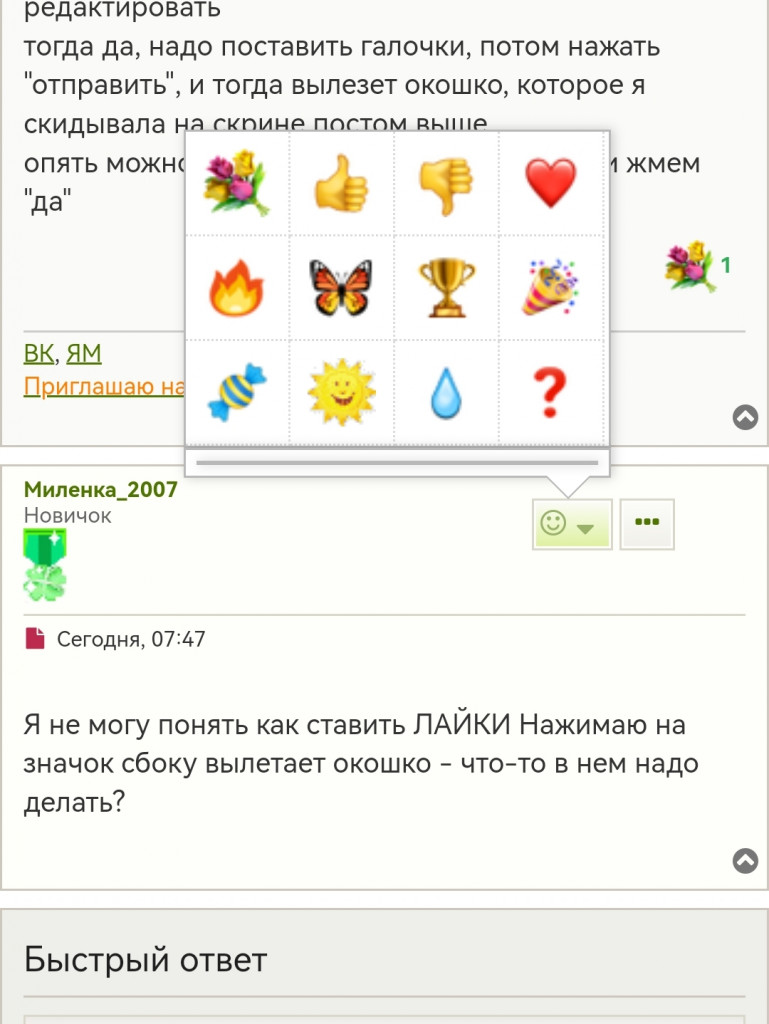 Нажимаем на смайлик, вылетает окошко с реакциямиМиленка_2007 писал(а): ↑06 янв 2023 00:47 Я не могу понять как ставить ЛАЙКИ Нажимаю на значок сбоку вылетает окошко - что-то в нем надо делать?