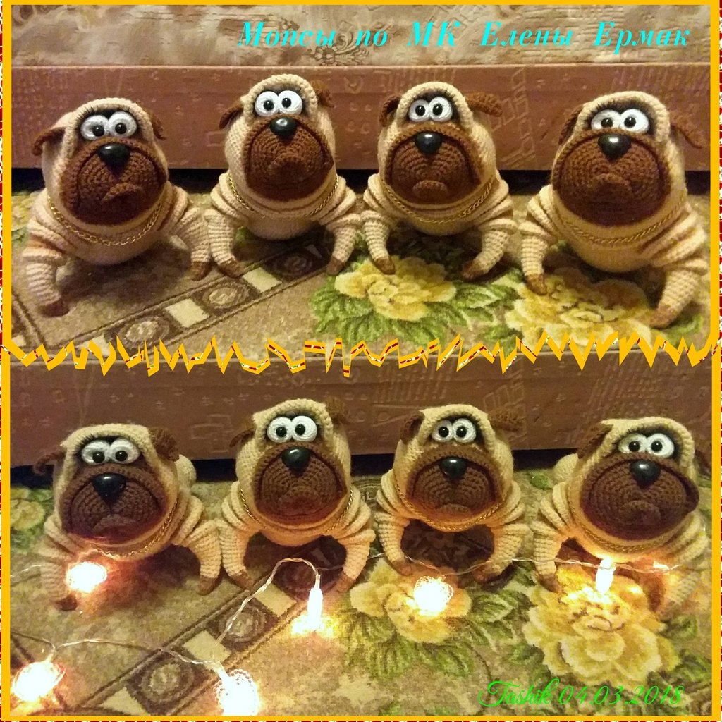 Мопсы, одни были связаны в подарок родным на новый год, другие были связаны в подарок бывшему коллективу