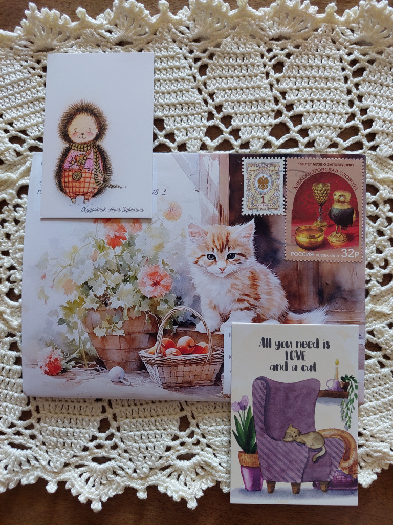 Сам конверт, как открытка, тоже с котиком(таких ещё не видела, красота) и маленькие открытки в коллекцию.