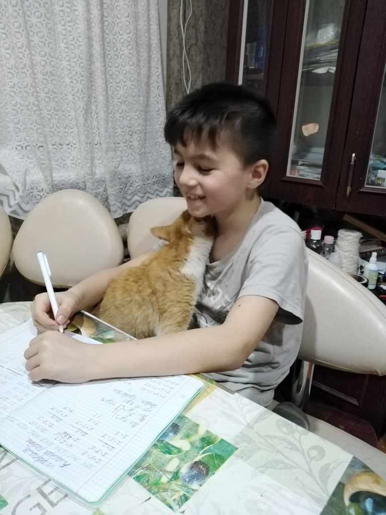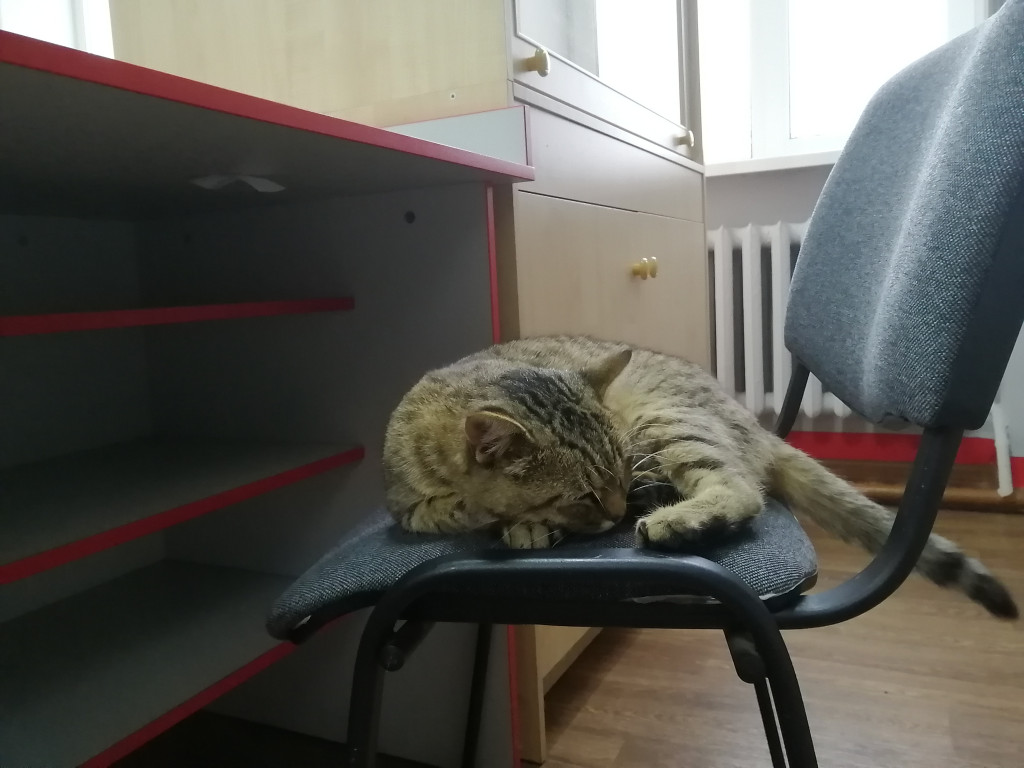 За летний лагерь прибился, откормился, никто его не гонит, не обижает, даже ошейник кто-то из начальных классов изобразил. Вот он и гуляет по школе. Там посидит, тут полежит, на урок зайдет, дети его глядят, за ушками чешут, как-то строгая школа становится добрее, когда в ней поселяется собственный кот)