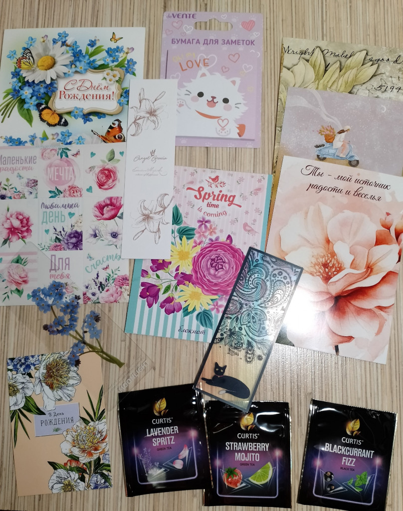 открытки, закладки, наклейки, блокнотики, чай А ещё в весенней коробочке мне @nisana прислала вкусности и нужности Девочки, дорогие мои, спасибо вам огромное за подарки, за внимание. Люблю вас и нежно обнимаю