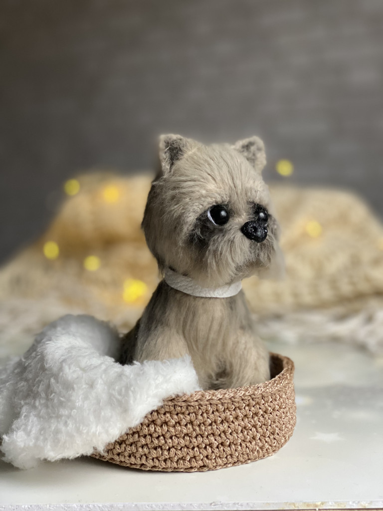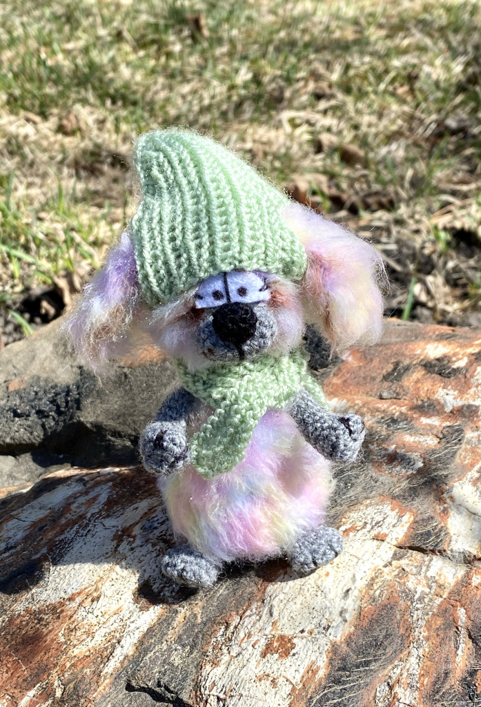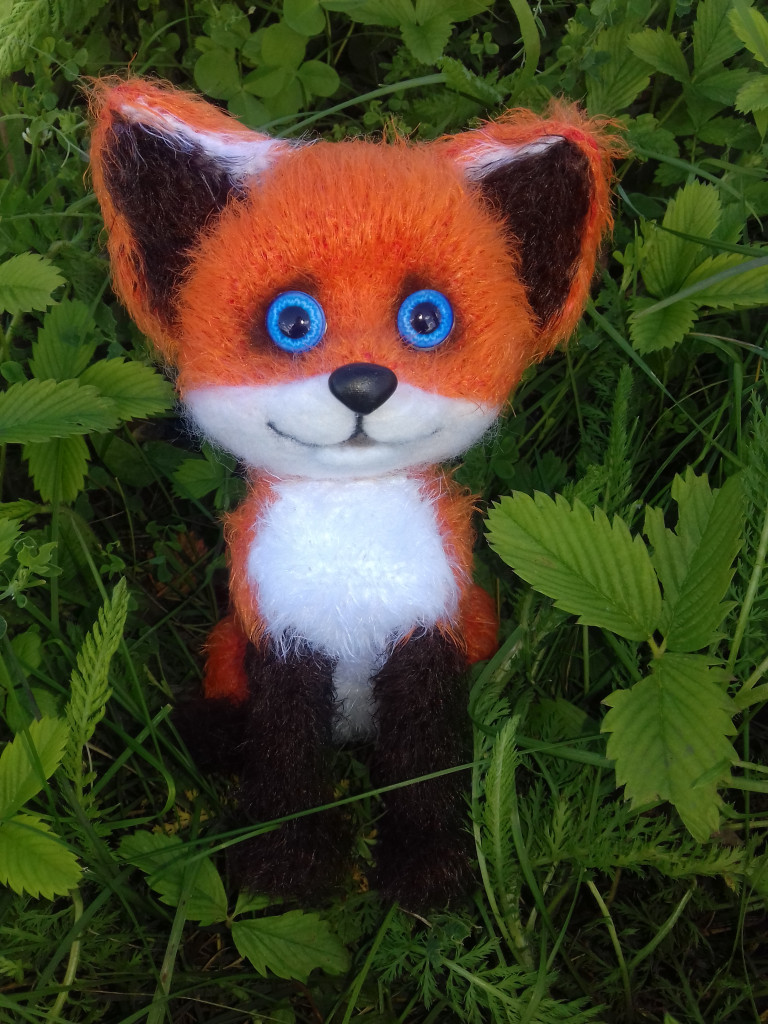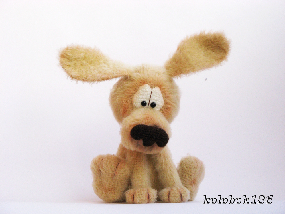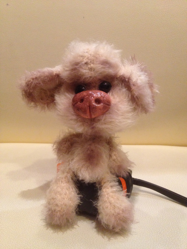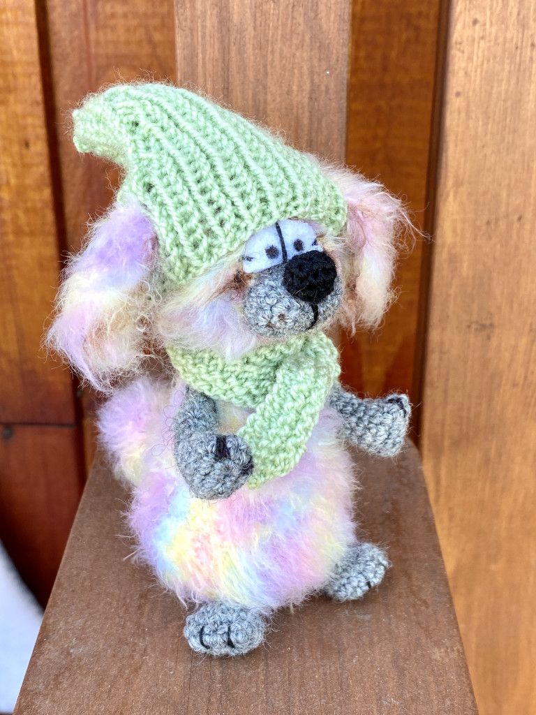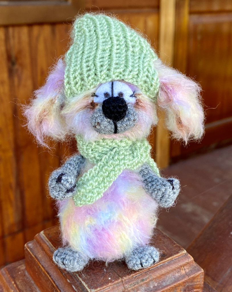 Малыш ростом 24 см, в длину 17 см (без учета хвоста). Связан из фактурной пряжи. Внутри - проволочный каркас. Глазки - стекло, носик из запекаемой пластики, водоустойчивая тонировка.