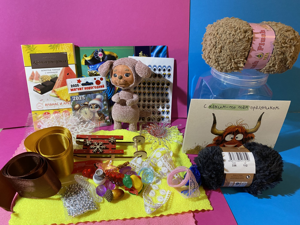 Неожиданно получила посылочку от Надюши n-maks1965, c мимишной собачкой. Эта симпатичная мордашка привезла много вкусностей и полезностей и новогодне-праздничное настроение. Напечатанные глазки, серебристые бусинки, огроменную шоколадку с изысканным вкусом, оригинальный чай и аж 3 мешка с орешками и кажется сушеной смородиной. И даже ни разу не догадались попробовать ягоды посушить, а вкусно! Кисленькая и витаминизированная, на работу возьму жевать. Вот завтра к зубному, а потом орехи пробовать. Пряжа - чудо, баночка для добра, снежинки блестящие, ну и всё яркое, веселенькое и разнообразное. Коробочка новогодняя, даже работницы почты улыбаются, выдавая. Вот сколько обменов, а каждый раз получаешь что- то этакое. Ну пёсель - прелесть! Даже не знаю из чего мордашка. Надюша, спасибо за праздник, за «белочкины» запасы на всю зиму ! Татьяна, спасибо за новогоднюю акцию!