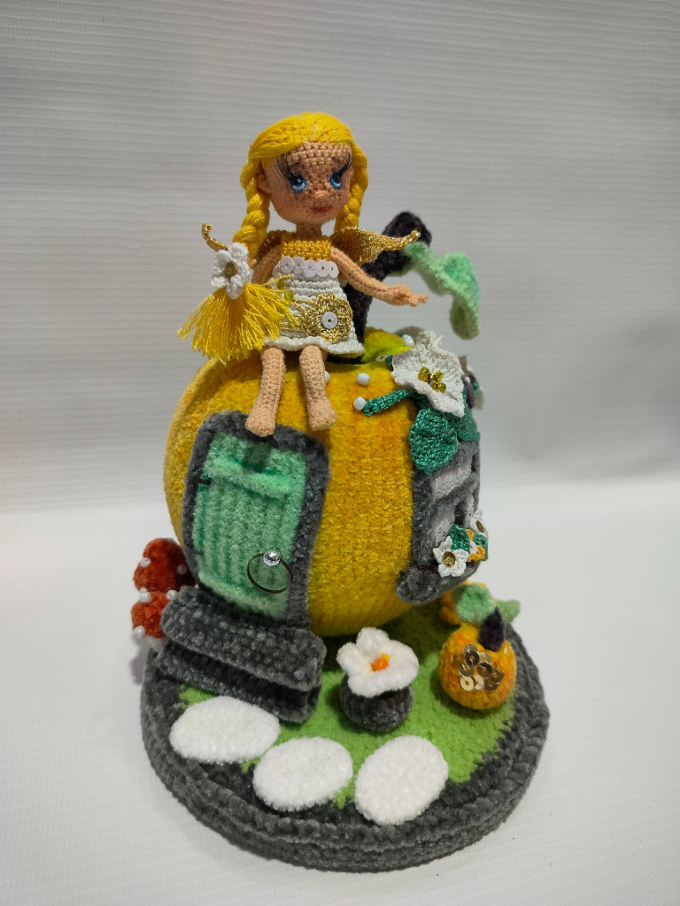 Высота яблока с подставкой около 15см, феечка 8см.