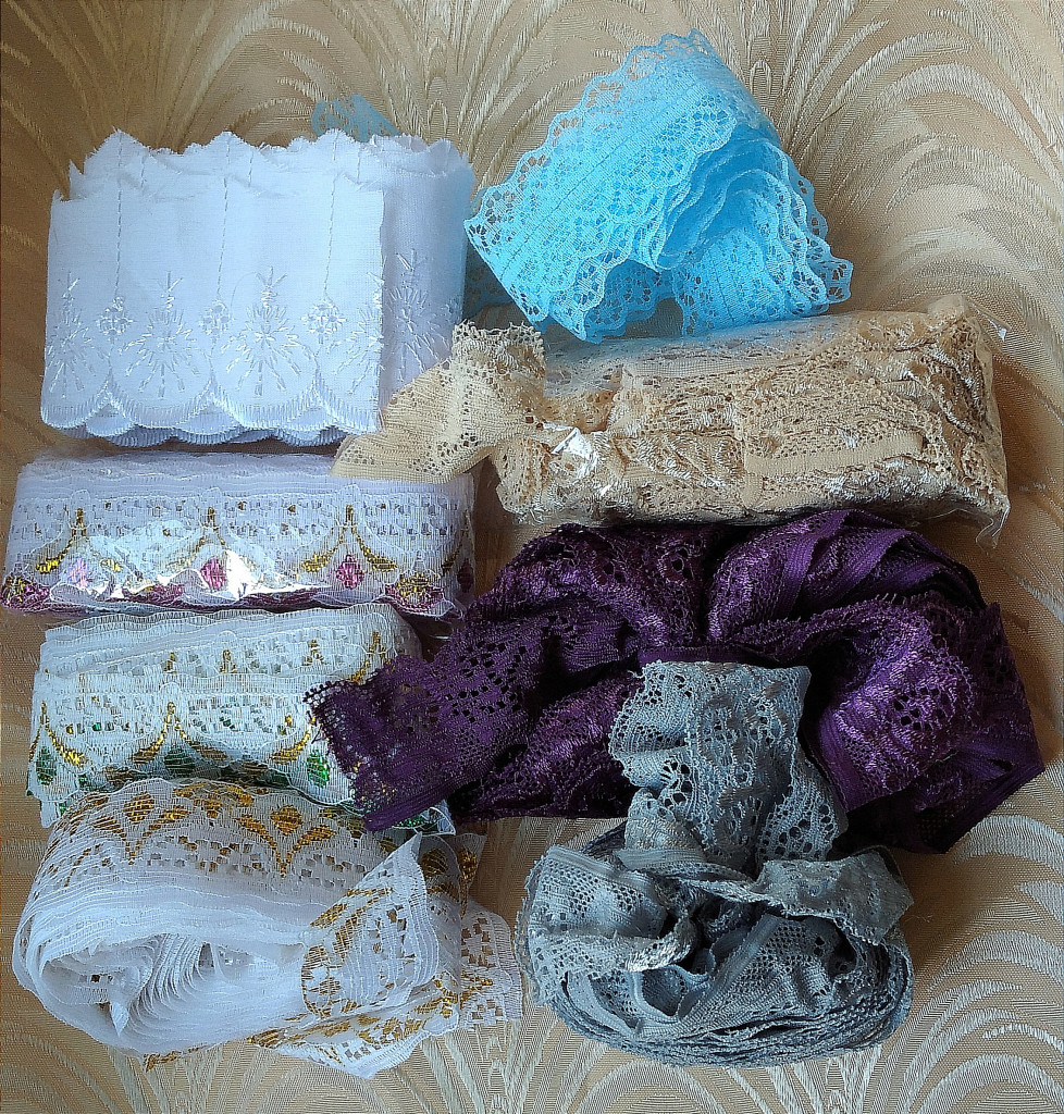 Лот14- 150р ленты кружево (сиреневый, бежевый, серый) эластичные, более 10 метров.