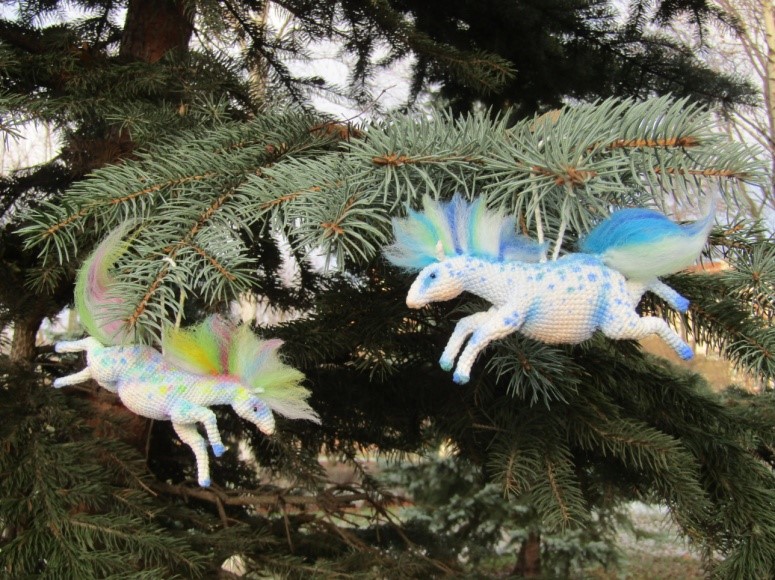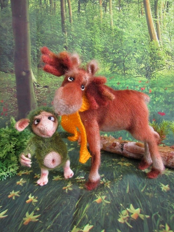 Крючок полюбила еще в детстве. Раньше не было соц.сетей и журналы по вязанию игрушек мне не попадались, информации было мало. Вязала в качестве подарков родным и близким в основном салфеточки, цветы, вазочки, схемы любила придумывать сама. Первой игрушкой была – интерьерная сова, она держала в лапках кашпо для цветов. Вязала всегда «от балды», следила только чтобы более-менее симметричная была игрушка, прибавки – убавки делала на глаз и петли не считала – вот жизнь то была! Изобрела все велосипеды какие было можно. В более взрослом возрасте я занялась лепкой из полимерной глины, лепила мордочки, а тушки вязала, тогда уже пришла в соц.сети и долго смотрела только в сторону лепки. Вязанные игрушки, если и где-то попадались, то как-то меня не цепляли. Пока я не увидела слона Тубула Александры Симба. Для меня это было что-то не реальное! У Саши схемы еще не было на тот момент и я даже и не мечтала что что-то подобное когда-нибудь свяжу. Но эта тема меня заинтересовала. Нашла много очень интересных авторов, решила попробовать – как это вязать по готовой схеме. Первой игрушкой была собачка от Ирины Невельской, благодаря ей я узнала и про форум и там уже втянулась в вязание игрушек окончательно. Лепка была отодвинута далеко на второй план, но она мне очень пригодилась в оформлении игрушек. По началу записалась, наверное, на все онлайны какие только можно было, накупила кучу схем, просто не было сил удержаться. Кстати, и на вязание великолепного слона Тубула тогда появилась запись и я его связала и поняла, что как говорят «глаза боятся – руки делают», я его осилила и он до сих пор красуется у меня на полочке.