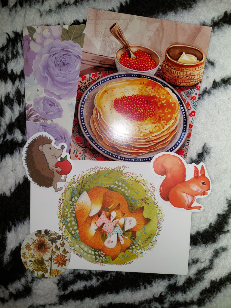 Третий конверт от Юли @Просто мама. В нём открытка по обмену "Мать и дитя" с чудесными лисичками и поздравление с масленницей, ещё подарочки.