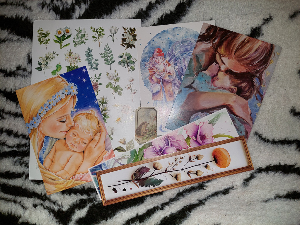Четвертый конверт от Юли @Ю.Ю. тоже по обмену "Мать и дитя". Нежная открытка с мамой и малышом, подарочки: открытки, наклейки, очень красивые закладки.
