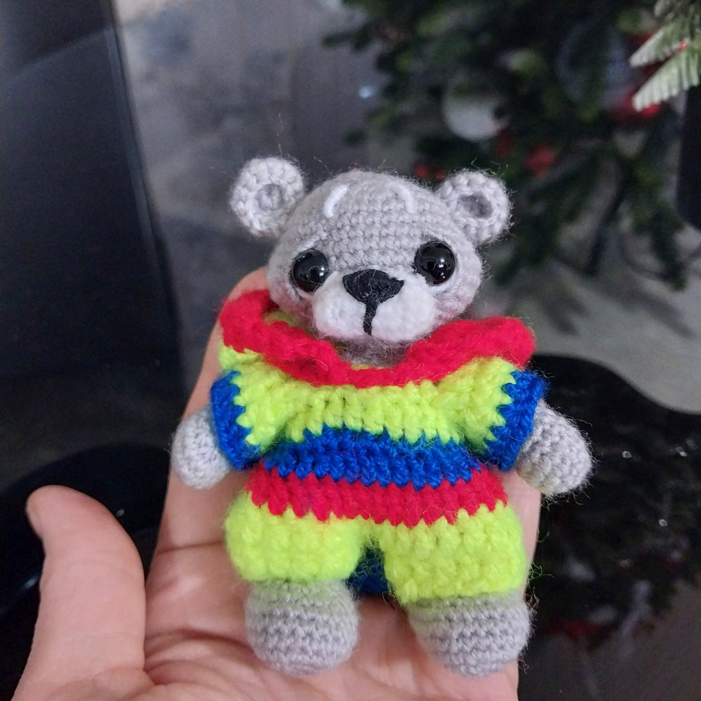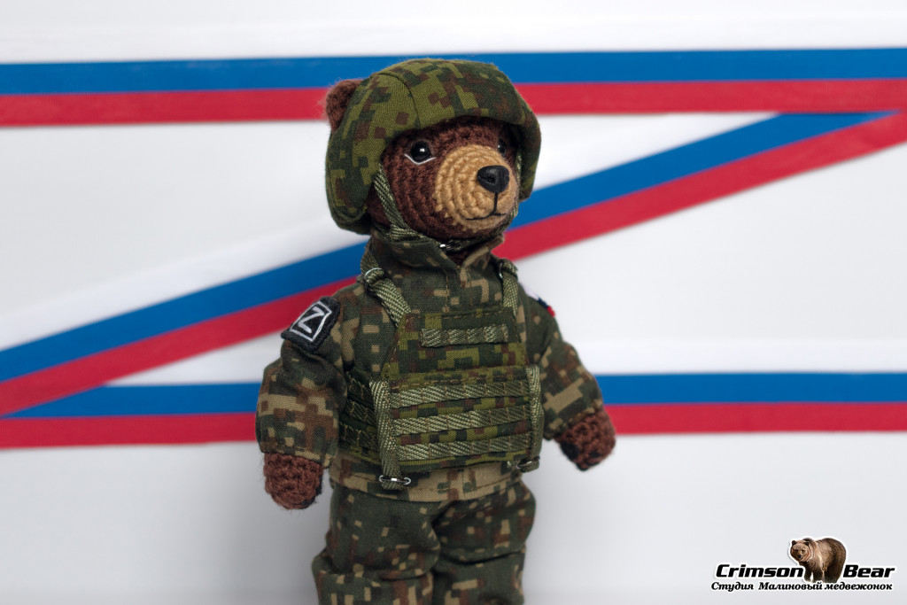 Размер сувенира 15 см. Подвижные лапы на каркасе и голова на шплинтовом креплении. Специальная петелька для подвешивания. Каску и бронежилет можно снимать.