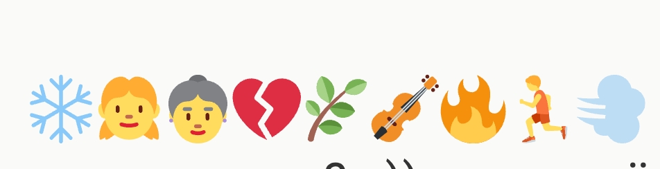 Снежинка указывает на холодный климат или зимнее время года, главные персонажи девочка и бабушка? ( это ж бабушка?) Разбитое сердце говорит нам о некой драме, а растение? Это лес? Поляна, дерево... Скрипка может быть просто скрипкой или символизировать музыку. Огонь) ну либо история огонь! Либо это некие испытания. Бегущий мальчик - путешествие? Побег? И облако пара это ветер? Скорость?