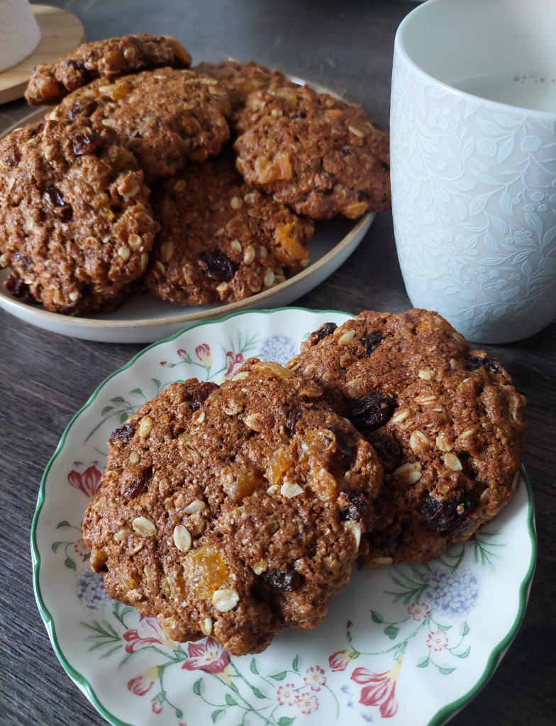 Сахара я кладу меньше, а вот сухофруктов побольше и поразнообразнее :-)) и практикую не с пшеничной, а с цельнозерновой мукой. Вместо яиц можно банан добавить, печеньки будут мягче и рыхлее (как вариант без яиц).