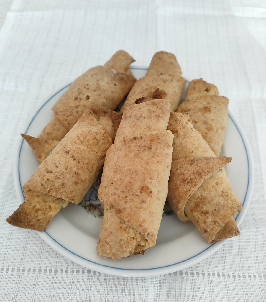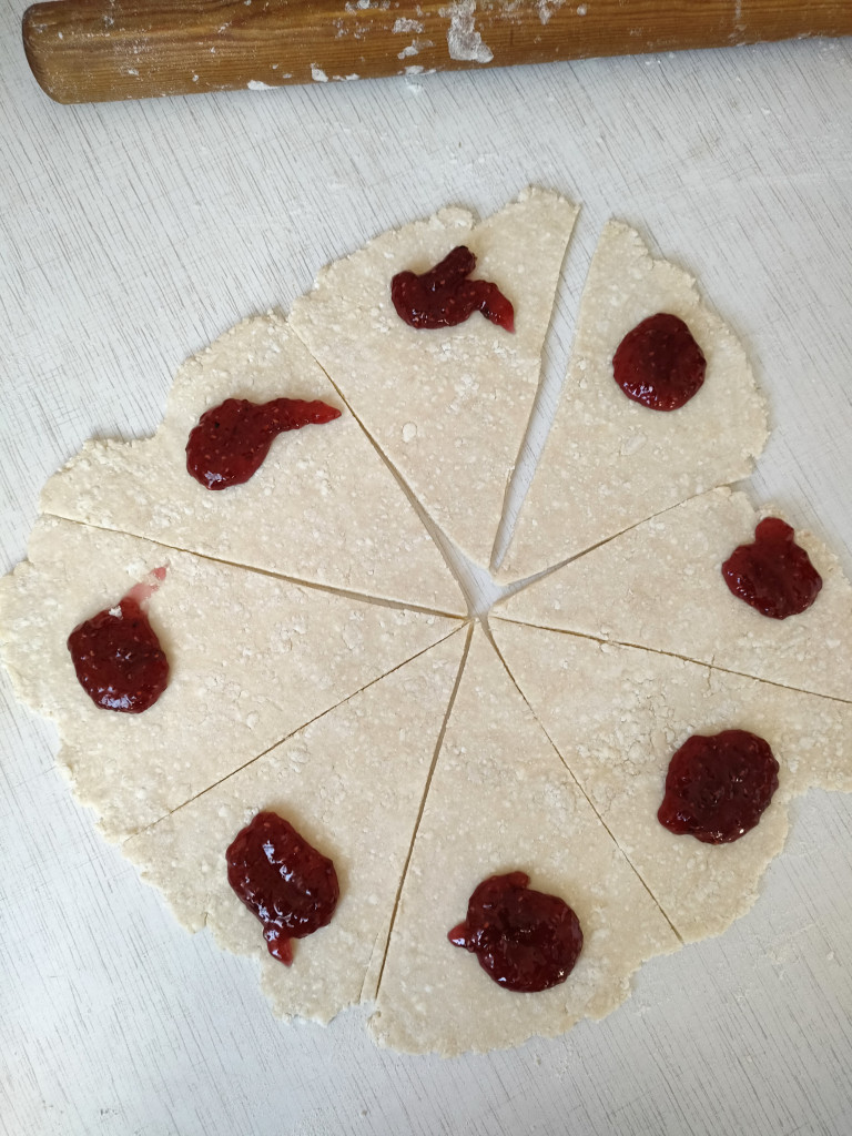Быстро замесить тесто, разделить на 2 части. Каждую часть раскатать в круг толщиной до 0,5 мм, разрезать на 8 секторов. Далее см. фото. Выпекать примерно 20 мин. При температуре 200 градусов.