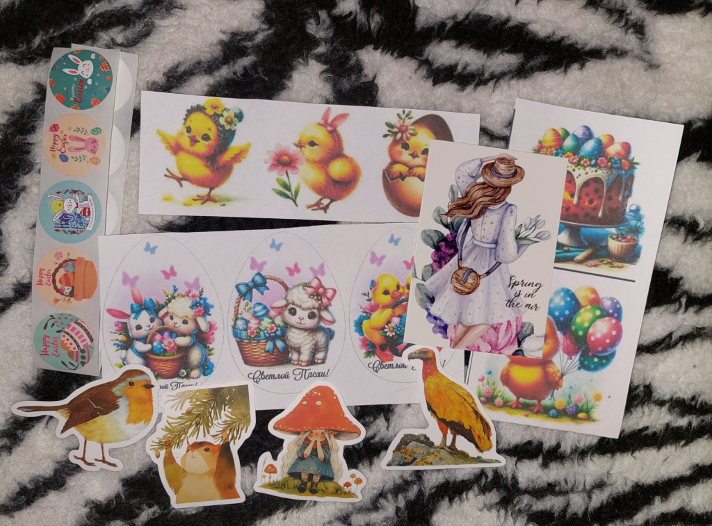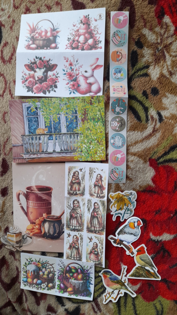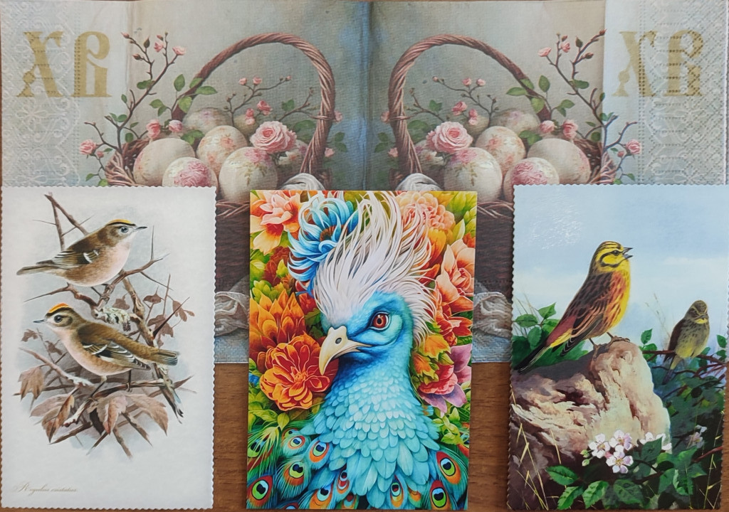 от Жанночки @nisana по обмену "Птички" обменная, сюрпризная и по выбору (Павлин ко мне прилетел)! Поздравление с Пасхой и еще очень милые открыточки с наклейками!