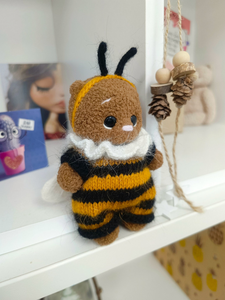 Размер сувенира 15 см. Подвижные лапы на каркасе и голова на шплинтовом креплении. Специальная петелька для подвешивания. Каску и бронежилет можно снимать.