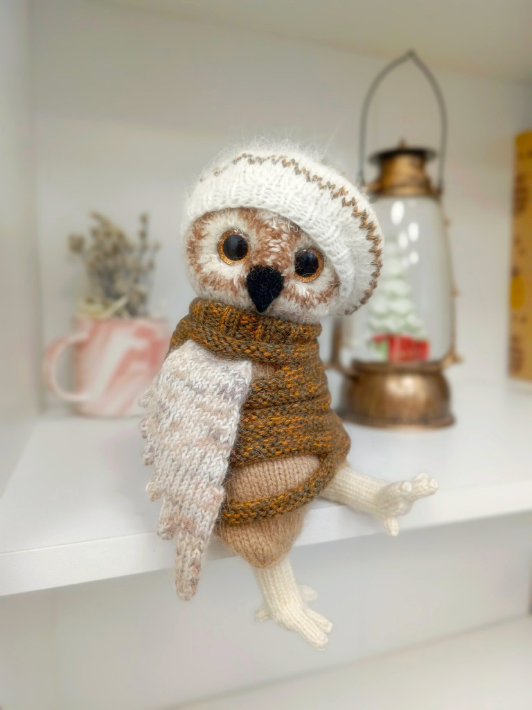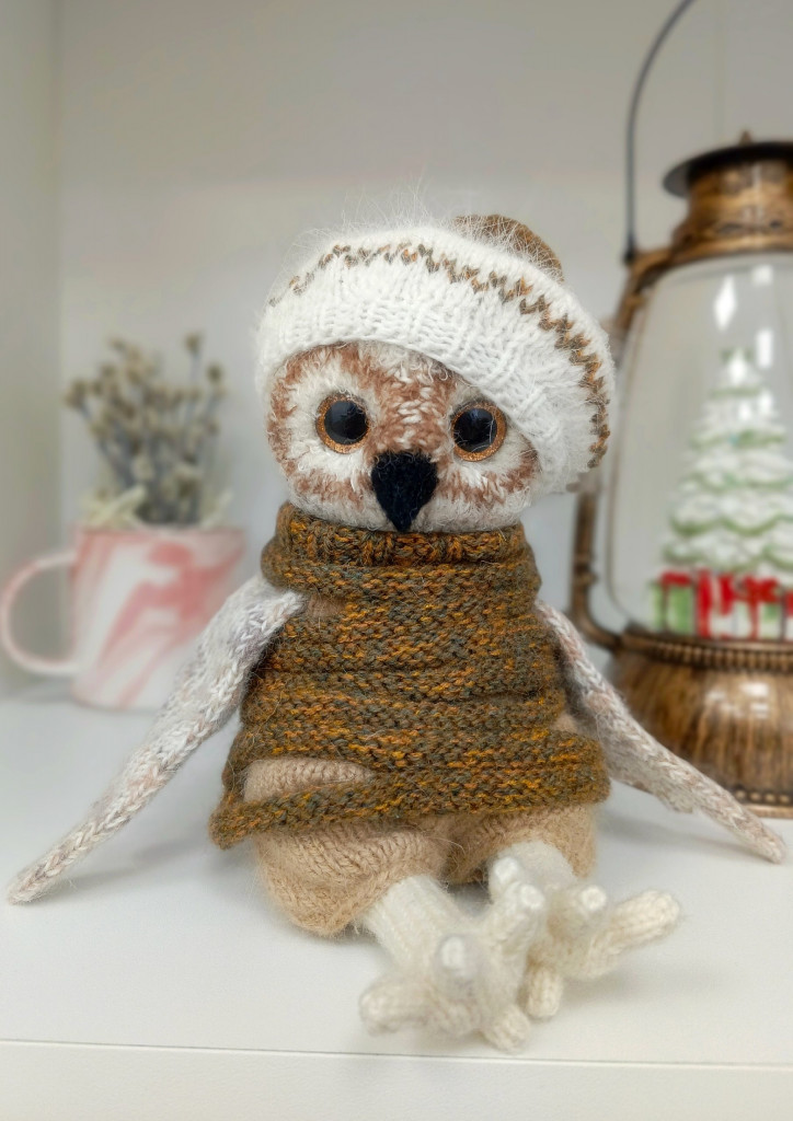 Филин в колпаке и фартуке повара. Размер 14 см. Связан из мохера, в лапках и крыльях проволочный каркас.