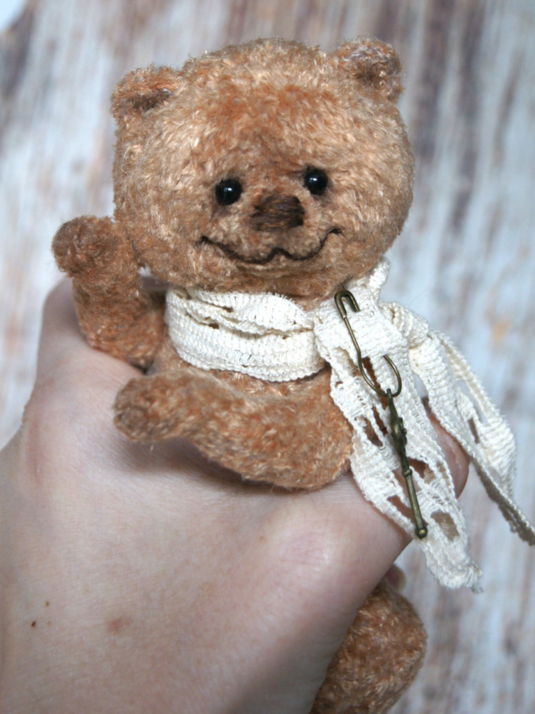 Кевин. Ростиком 12 см, связан из английской меховушки (похожа на минк ). Шплинтовое крепление конечностей, носик и пяточки из поилмерки. Утяжелен металлическим гранулятом.