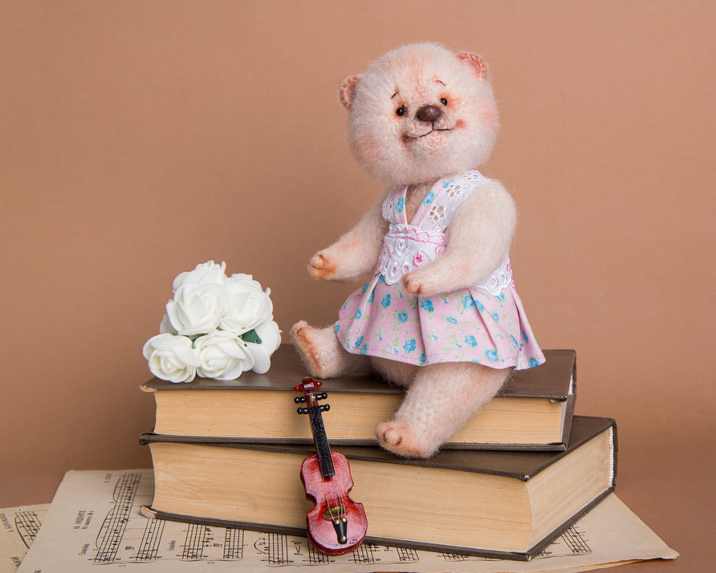 Мишутка Стеша связана в рамках тестирования МК "Урсула" Анны Будановой . Сидя 15 см, стоя 18 см. Стоит с поддержкой. Выполнена в стиле тедди: лапки и голова подвижны, на шплинтовом креплении. Платье снимается.