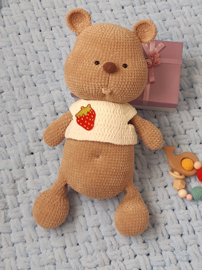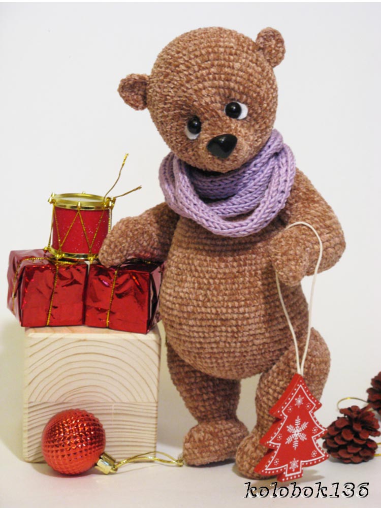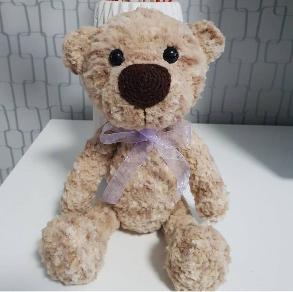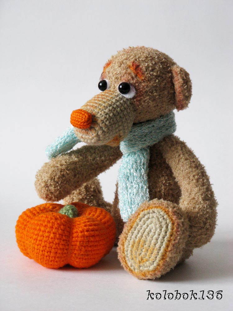 Эта мишуля связана из софти. Все лапы и голова на шплинтовом крепление. Голова качается. Чей мк к сожалению не помню. Если кто-то узнал напишите пожалуйста, для того чтобы отметить автора.