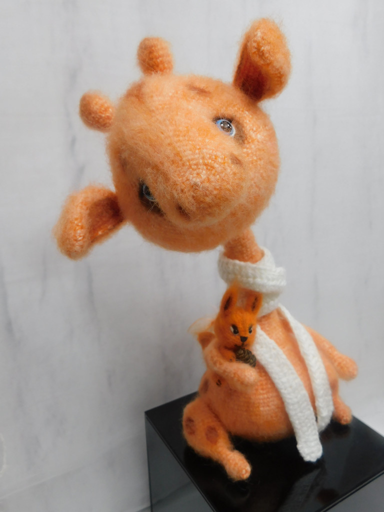 Получилась примерно 18 см сидя, а если поставить на ножки, то 22 см. Самостоятельно не стоит.