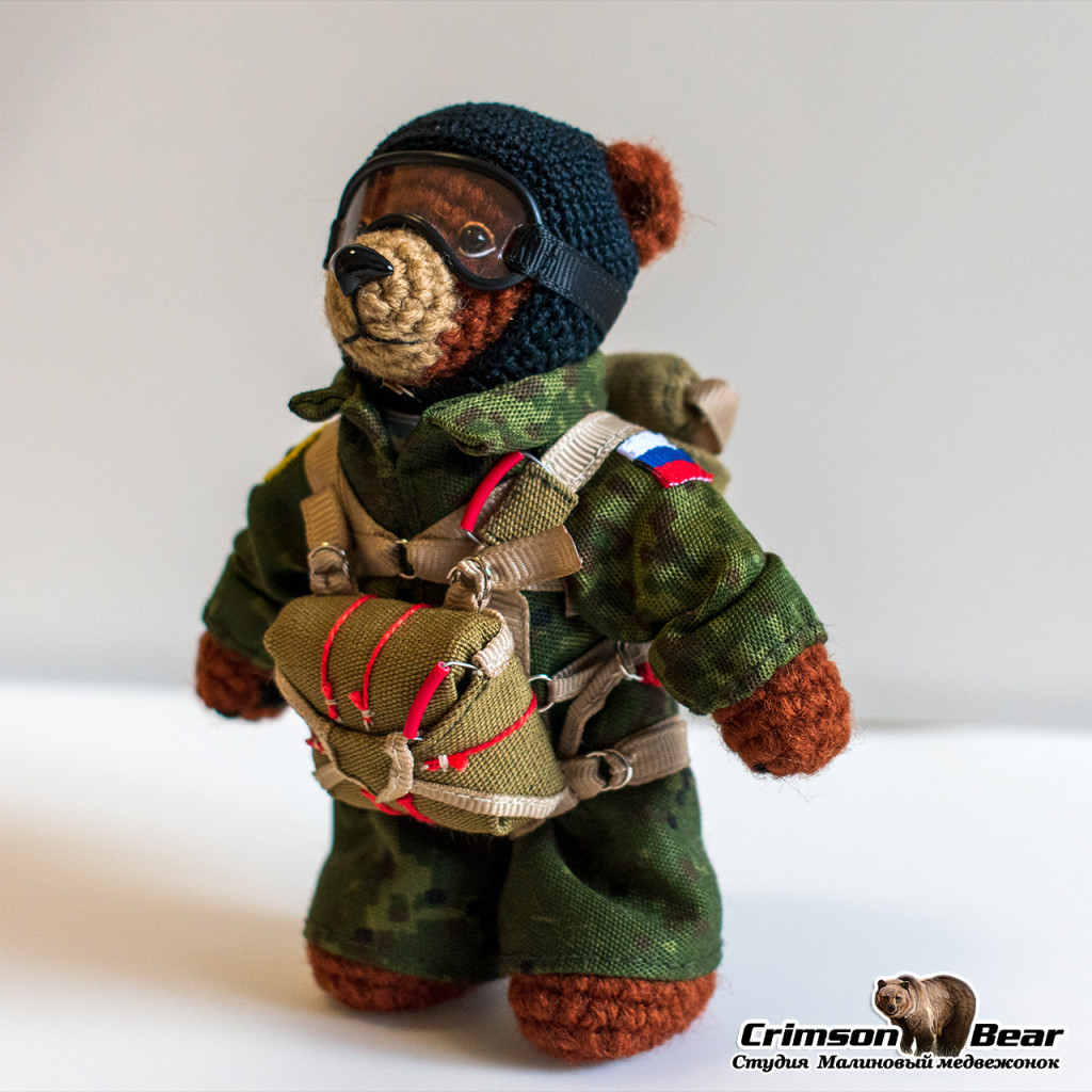 Мишка с парашютом Д-6 и нашивкой военной разведки. Размер 14 см. Лапы на проволочном каркасе, голова на шплинтовом креплении.