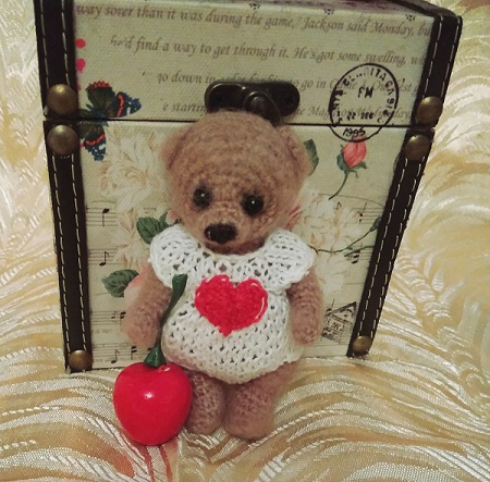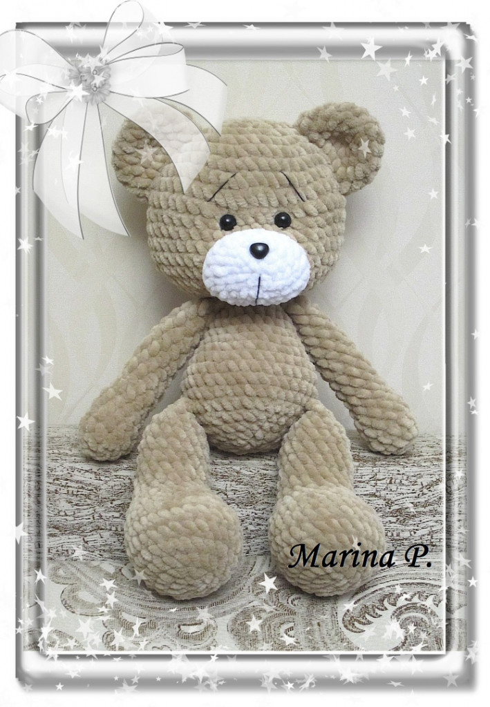 Добрый день. Мой мишка-тедди в сарафане связан недавно по МК Людмилы Жердевой. Ручки-ножки-голова на шплинтовом креплении