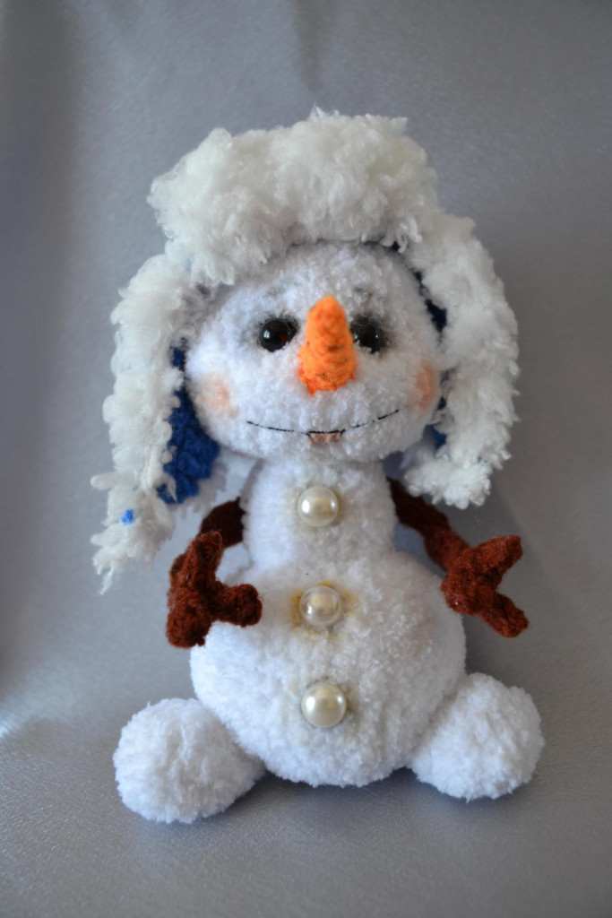 Этот снеговик не вязанный, а сделан из папье маше, синтепона и флиса, учавствовал в школьном, потом в районном, а потом в общероссийском конкурсе, занял 2-е место по России, благодаря ему мы получили билет на ёлку в Кремль, правда было это уже давно)))
