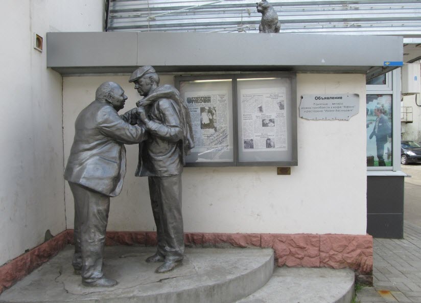 Памятник Ярославу Мудрому, Часовня Казанской Божьей Матери, Церковь Иоанна Предтечи В 2009 г. в Ярославе на ул. Первомайской установили памятник медведю, быстро завоевавший славу новой городской достопримечательности. Каждый турист теперь старается потереть изваяние животного и загадать желание в надежде на то, что грозный, но непременно добрый мишка исполнит сокровенные мечты. Местные жители даже сердятся, что скоро на скульптуре не останется живого места из-за такой народной популярности. Скульптура кошки. В Интернете нашла информацию "Именно дымчатые кошки ловили в Ленинграде крыс, которые изрядно расплодились там после блокады. А родом эти кошки были из Ярославля. В честь них и памятник." Но у нас не встречала подтвержденной информации) Просто кошка, которую многие гладят, когда проходят мимо) Памятник водопроводчику Афоне и штукатуру Коле — героям комедии Георгия Данелии «Афоня» — является одной из самых популярных народных достопримечательностей Ярославля. Потрясающее портретное сходство с персонажами, колоритность скульптурной группы и любовь россиян к кино истории непутевого сантехника обеспечивают не иссякающей интерес гостей города. и в заключении)