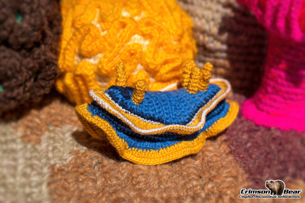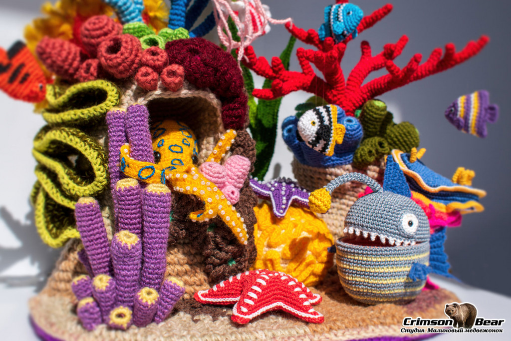 Размер основания композиции 28х20 см., высота 33 см. Длина осьминога с щупальцами 14 см. Маленькие рыбки по 4 см. Моллюск хромодорис 8 см. в длину. Кораллы выполнены из пряжи с проволочным каркасом. Основание композиции и камни выполнены с применением гофрокаркаса. Изделие относится больше к сувенирной категории, но отдельные элементы, в частности представители морской фауны по отдельности могут служить как игрушки для детей от 3х лет.