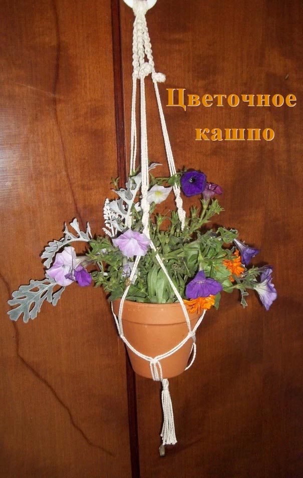 Решила попробовать плести макраме, но поняла что это не моё. И это первое и последнее мое изделие - кашпо для цветов.