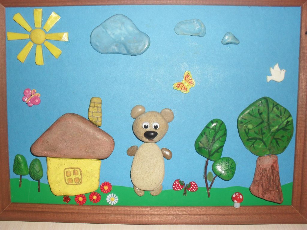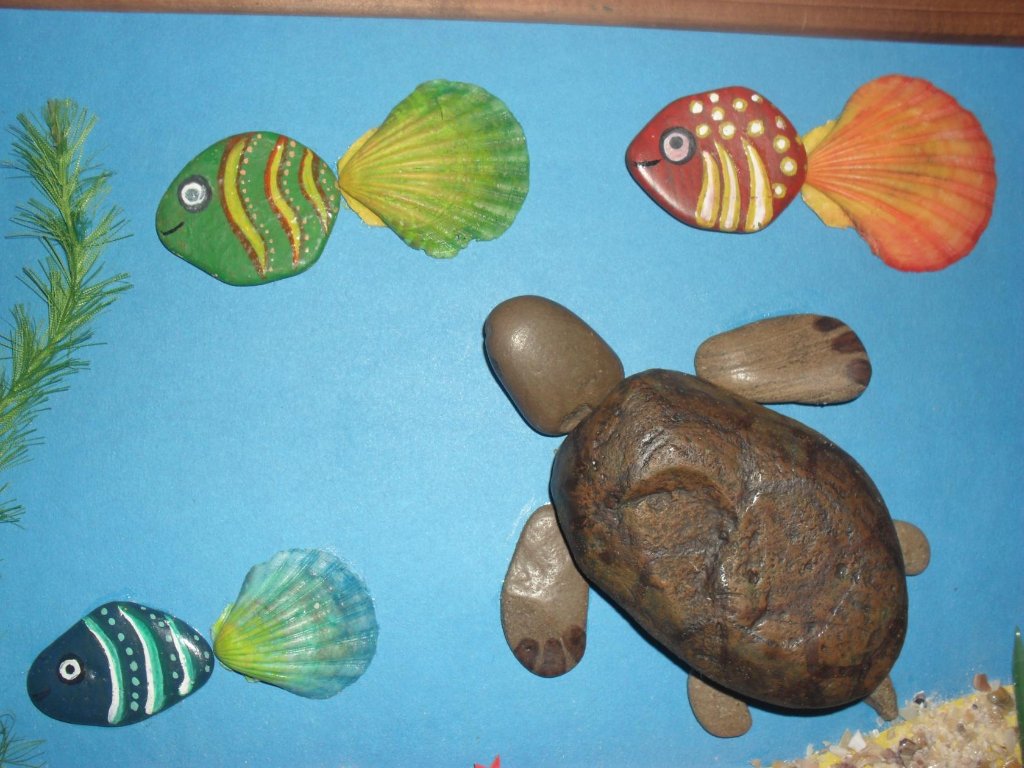 Аппликация из гальки и ракушек, раскрашено акварельными красками