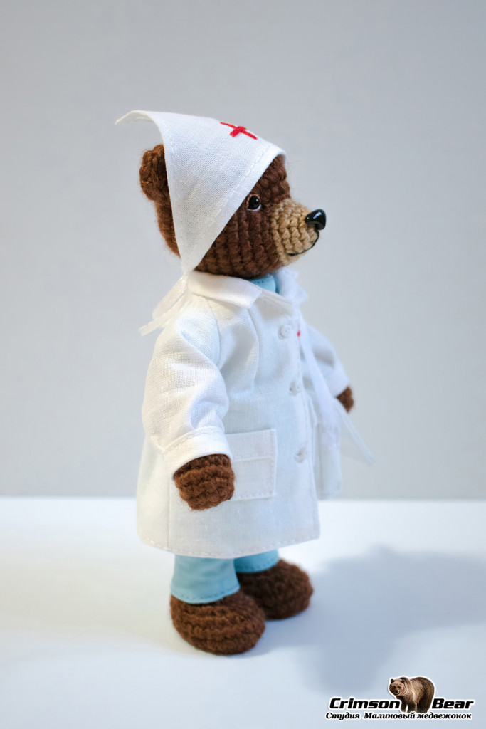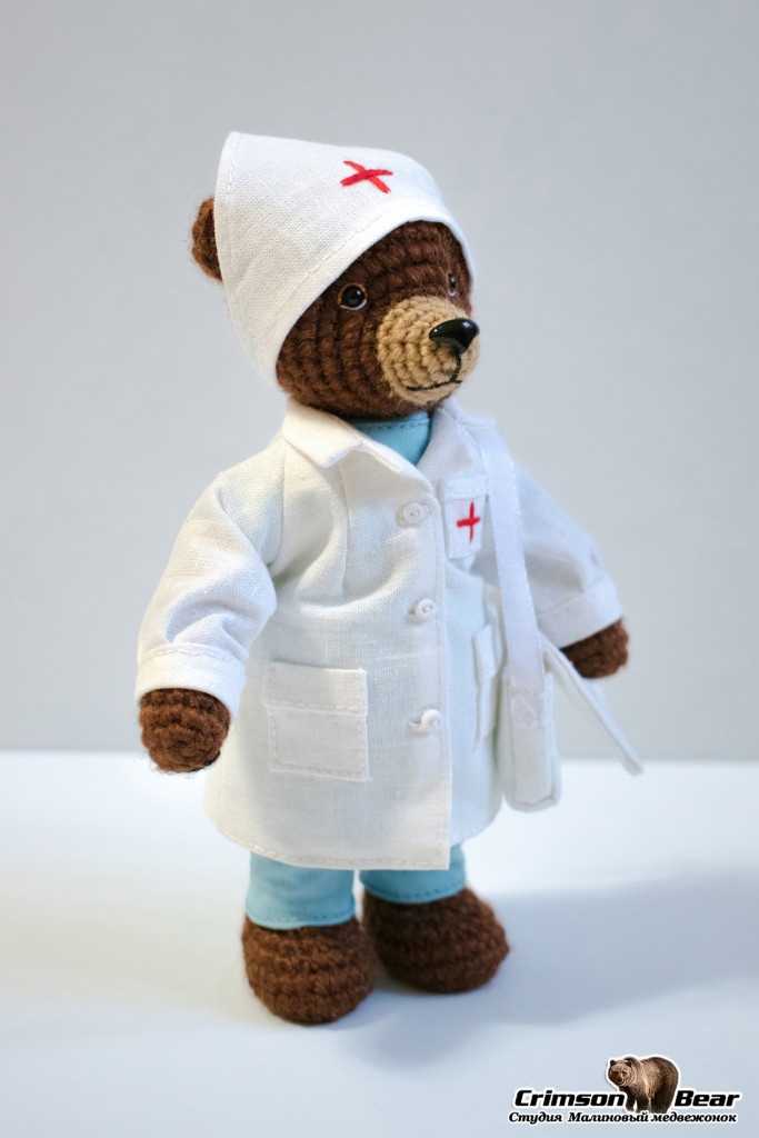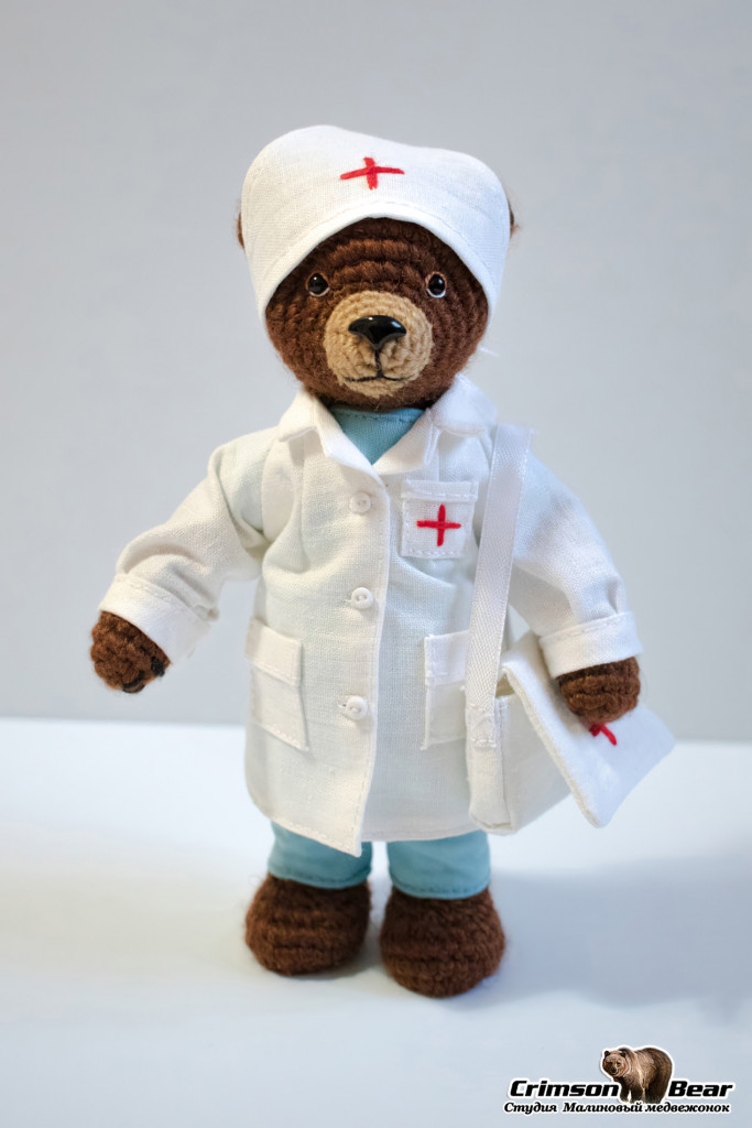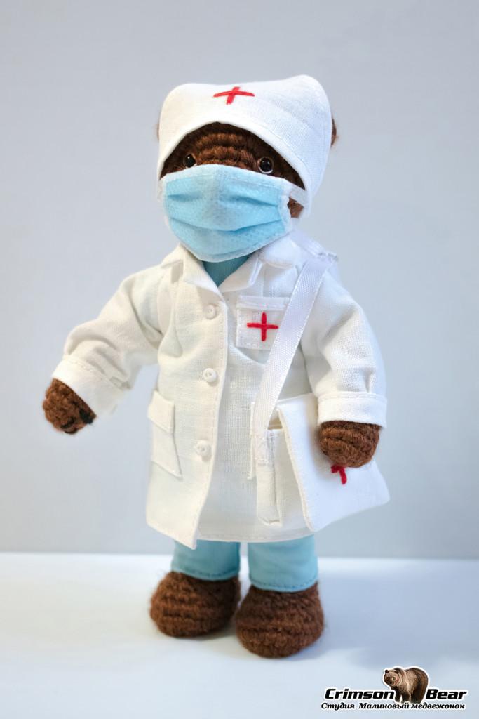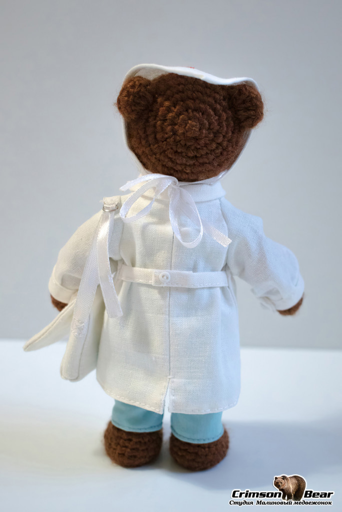 Мишка в медицинской форме, размером 15 см. Поворотная голова на шплинтовом креплении, подвижность лапам придает каркас из медной проволоки. Пуговицы, карманы и сумка функциональны.