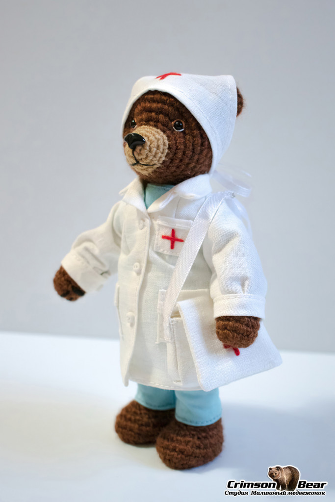 Мишка в медицинской форме, размером 15 см. Поворотная голова на шплинтовом креплении, подвижность лапам придает каркас из медной проволоки. Пуговицы, карманы и сумка функциональны.